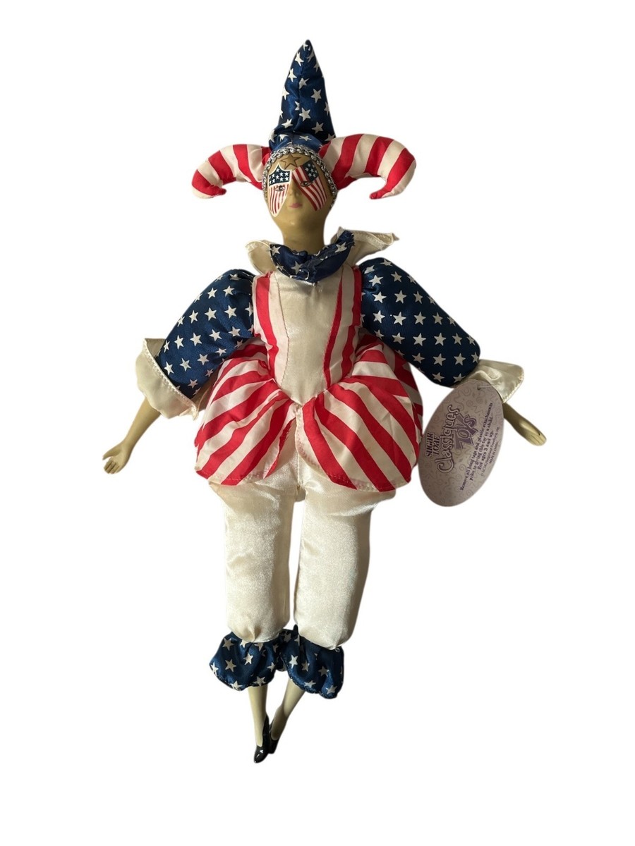 Vintage Sugar Loaf Good Stuff Jester Dolls Set Mardi Gras Valentine Hearts 16? Patriotic Flag 18?