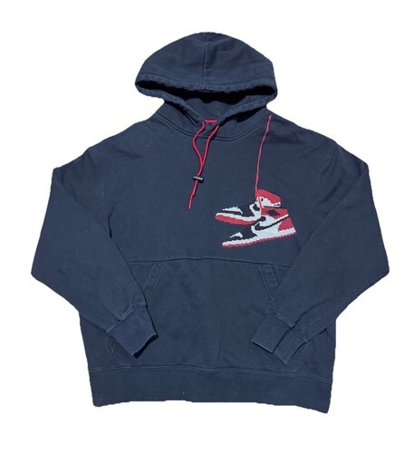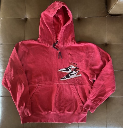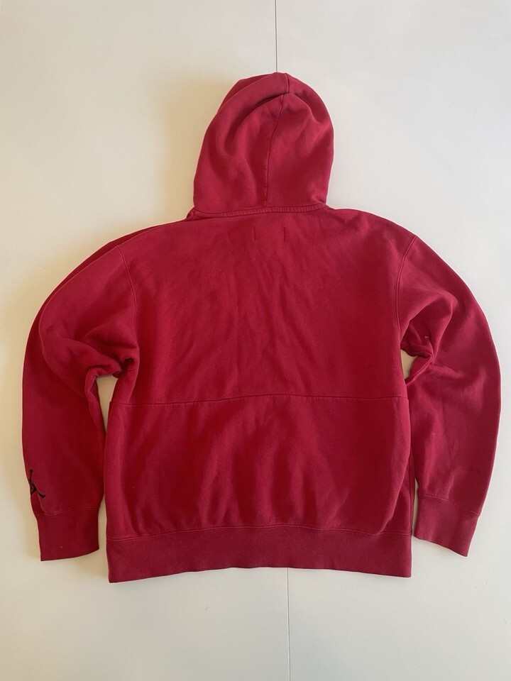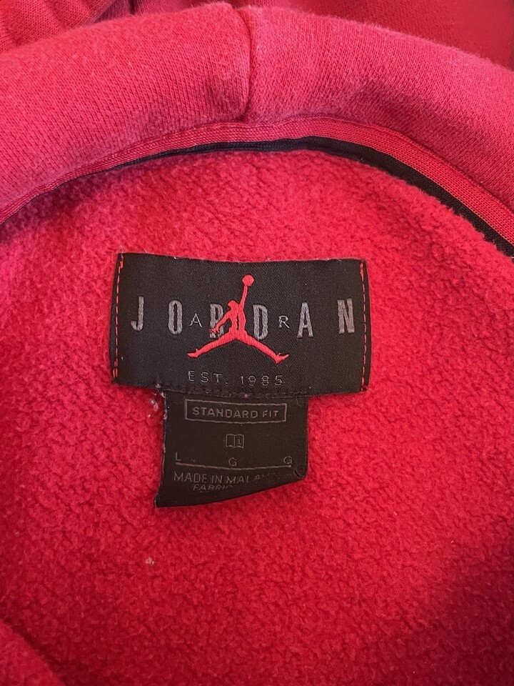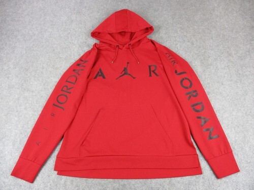 The product is a large size Air Jordan Brand hoodie in a classic red color with an embroidered Jordan shoes logo. The hoodie features a drawstring closure and a pullover style, making it suitable for both men and women. It is a stylish activewear piece that showcases the iconic Air Jordan brand logo, perfect for fans of Michael Jordan or sneaker enthusiasts.