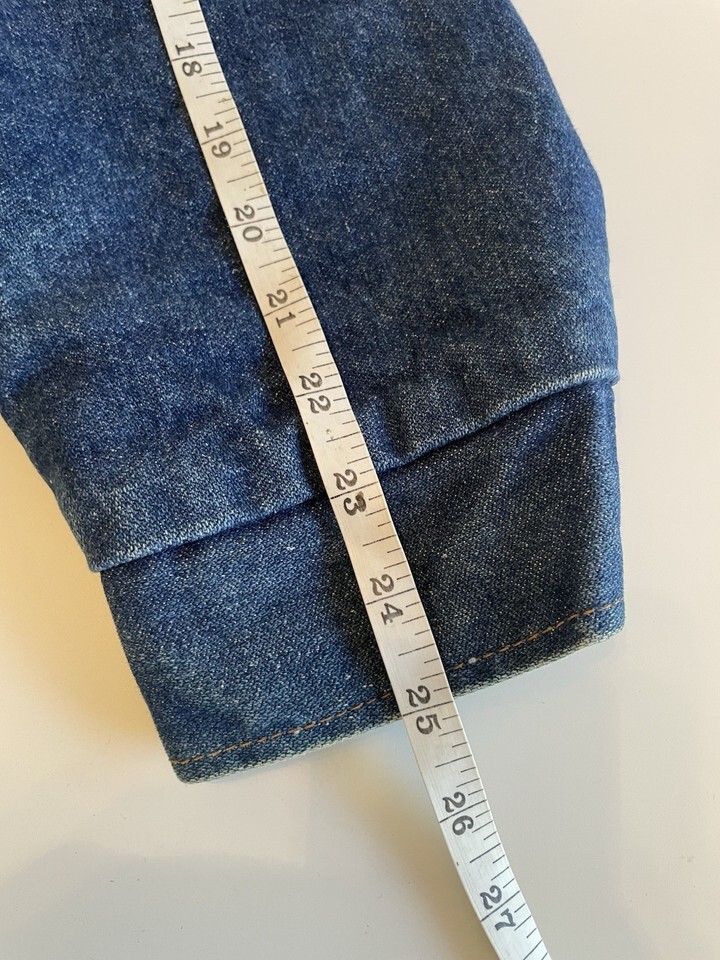 This Vintage Wrangler M-159 Denim Trucker Jacket is a classic piece of American workwear with a bomber jacket style. Made of durable cotton denim, this jacket features a spread collar and button closure for a timeless look. The blanket-lined interior provides warmth for the winter, fall, and spring seasons, making it ideal for travel, casual wear, or outdoor activities like walking, hunting, and hiking. The solid blue color and Western theme add a rugged touch to this mid-length jacket from a trusted brand like Wrangler, crafted in the USA. SEE PICTURES FOR SIZING MEASUREMENTS. Size on tag not legible.