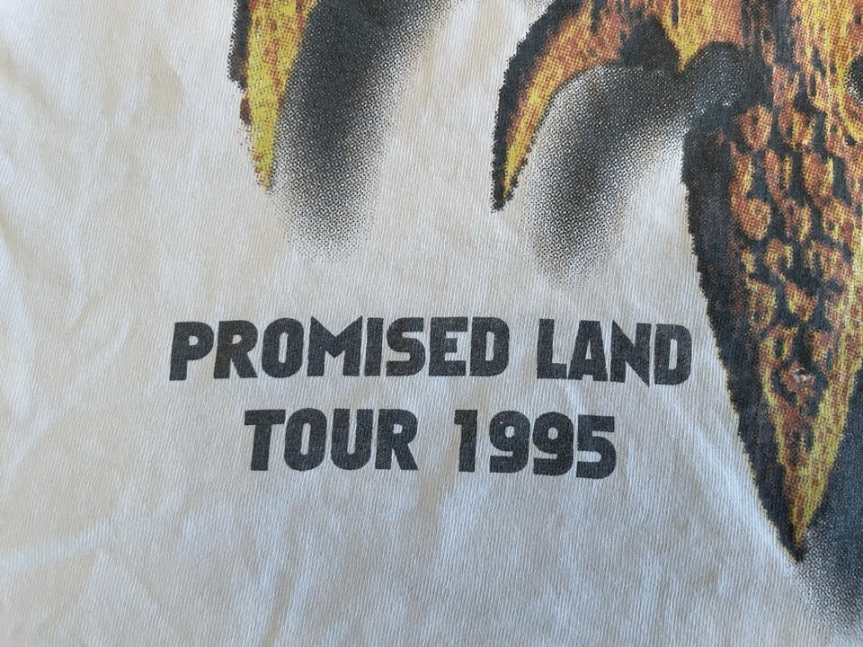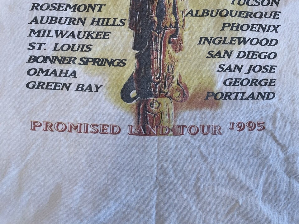 This vintage Queensryche Promised Land Tour 1995 graphic t-shirt features a beige color with a logo accent and concert tour locations and dates on the back. Made from a cotton blend material, this regular fit shirt has a crew neckline and short sleeves, making it ideal for the seasons of fall and spring. With a rock music theme and 90s retro design, this t-shirt is a perfect addition for fans of the band or collectors of music memorabilia. Machine washable for easy care, this shirt is a unique and nostalgic piece for any music enthusiast's wardrobe.