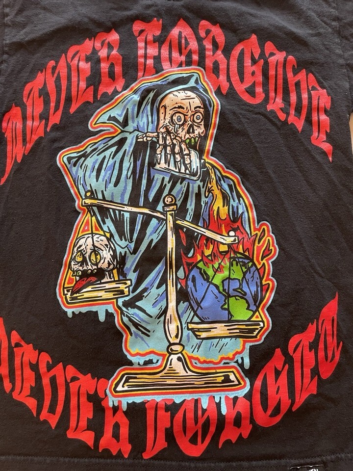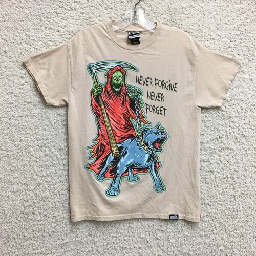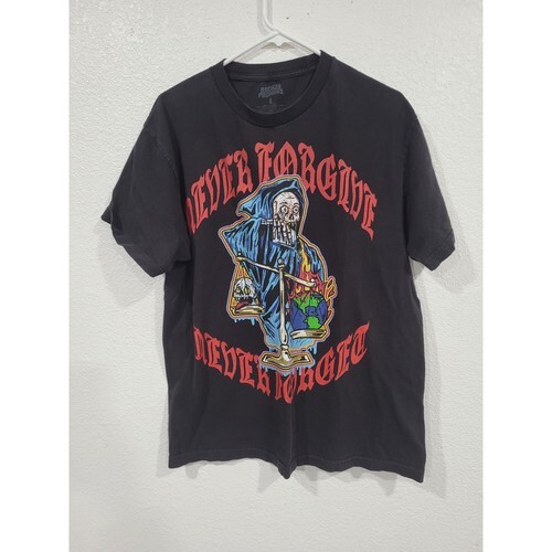 The Broken Promises Never Forgive Never Forget T-shirt is a multicolor all-over print shirt with a message of broken promises. It features a regular fit with short sleeves, perfect for casual wear. The brand, Broken Promises, adds a unique touch to this wardrobe essential, making it a standout piece for those who appreciate bold and distinctive designs.