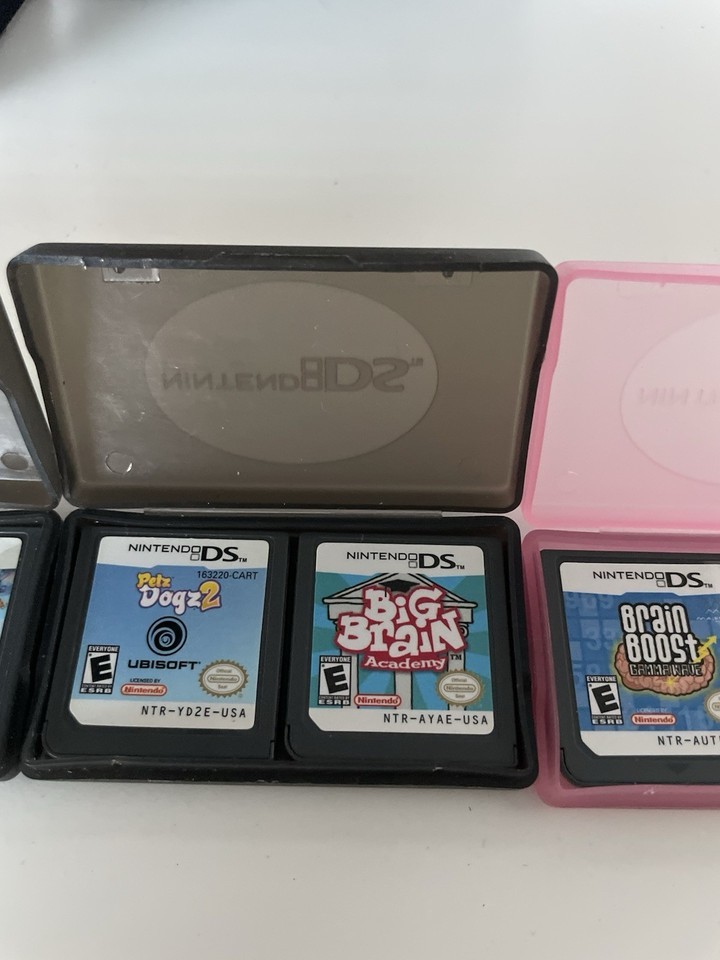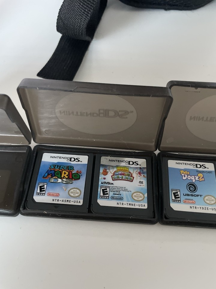 The LOT Nintendo DS Black Mini Backpack Travel Bag comes with 6 games such as Super Mario DS, Big Brain Academy, Petz Dogz 2 plus more and a Mario case/and instruction book (no game), making it a convenient and versatile accessory for Nintendo DS enthusiasts. The backpack is made of durable nylon material and features partitions and padding for added protection. With a sleek black color and the official Nintendo branding, this travel bag is a stylish and practical way to carry your Nintendo DS console and games on the go. Perfect for gamers looking to have their favorite games and accessories all in one compact and portable package.