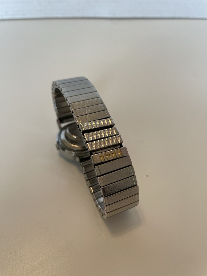 The Vintage Timex SSQ LCD Watch is a stylish timepiece with a silver band and blue round face, making it a charming addition to any casual outfit. This wristwatch features a metal band, stainless steel back case, and a digital display, giving it a classic and timeless look. Although it is not currently running, this vintage watch is sure to be a collector's item for enthusiasts of classic Timex timepieces. Needs new battery.
