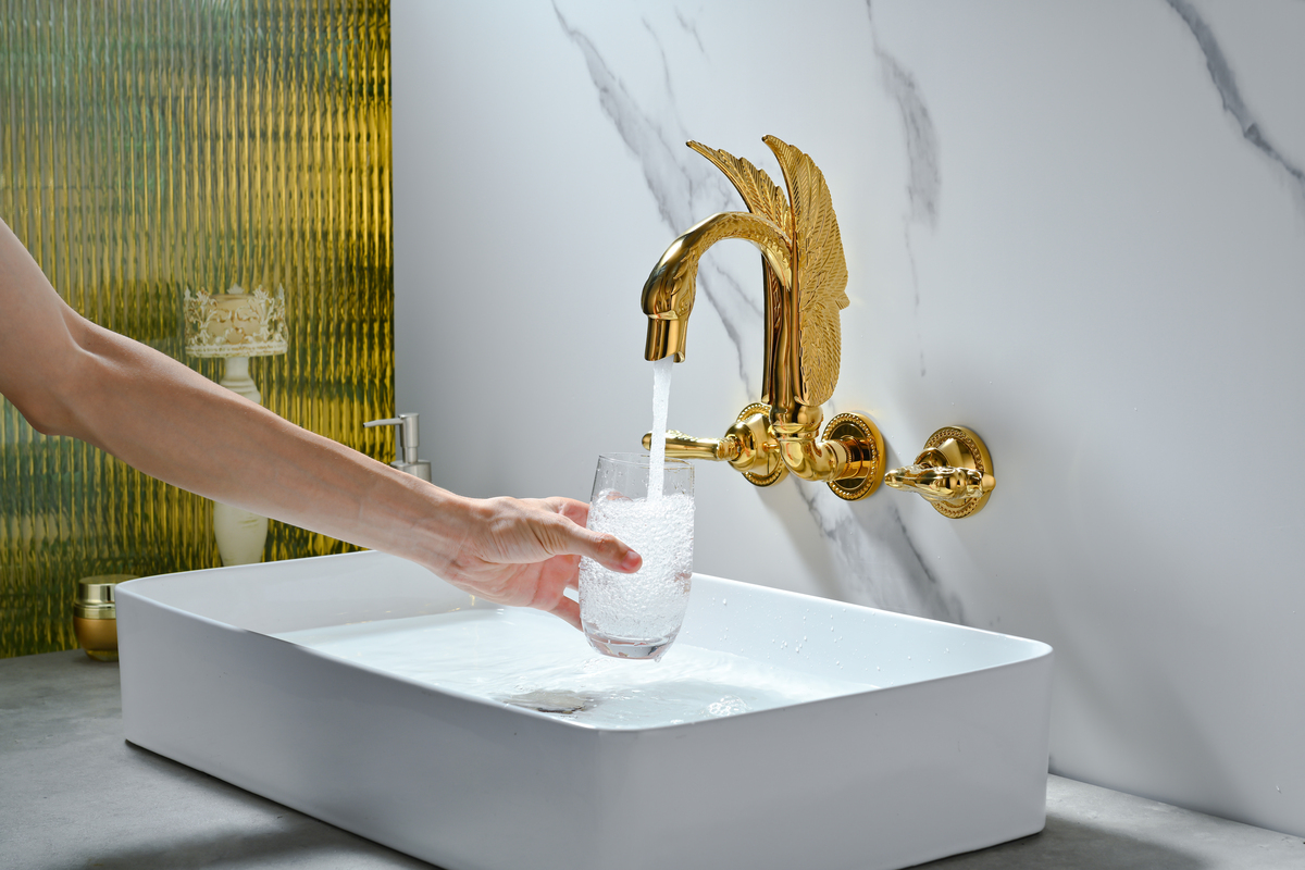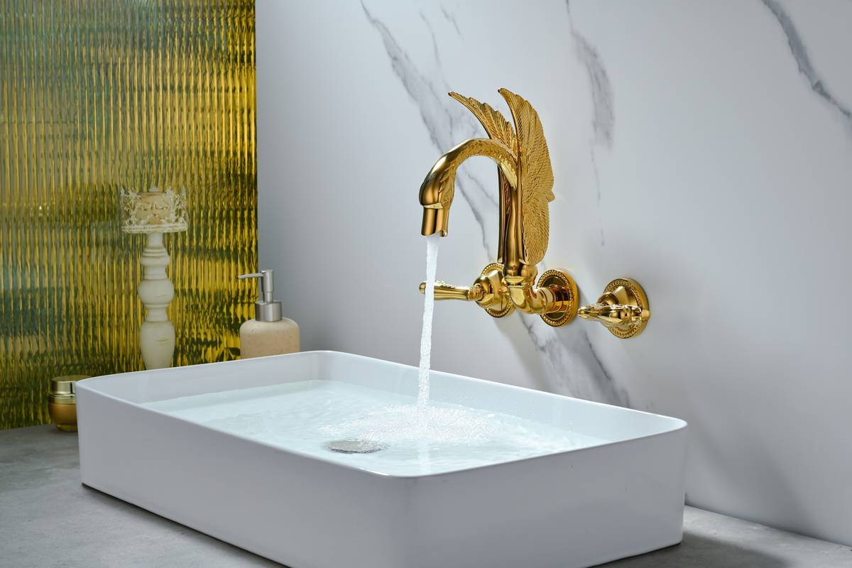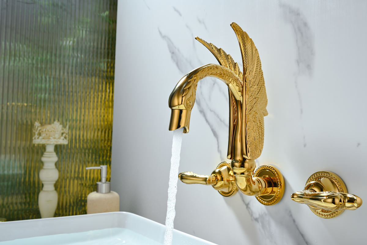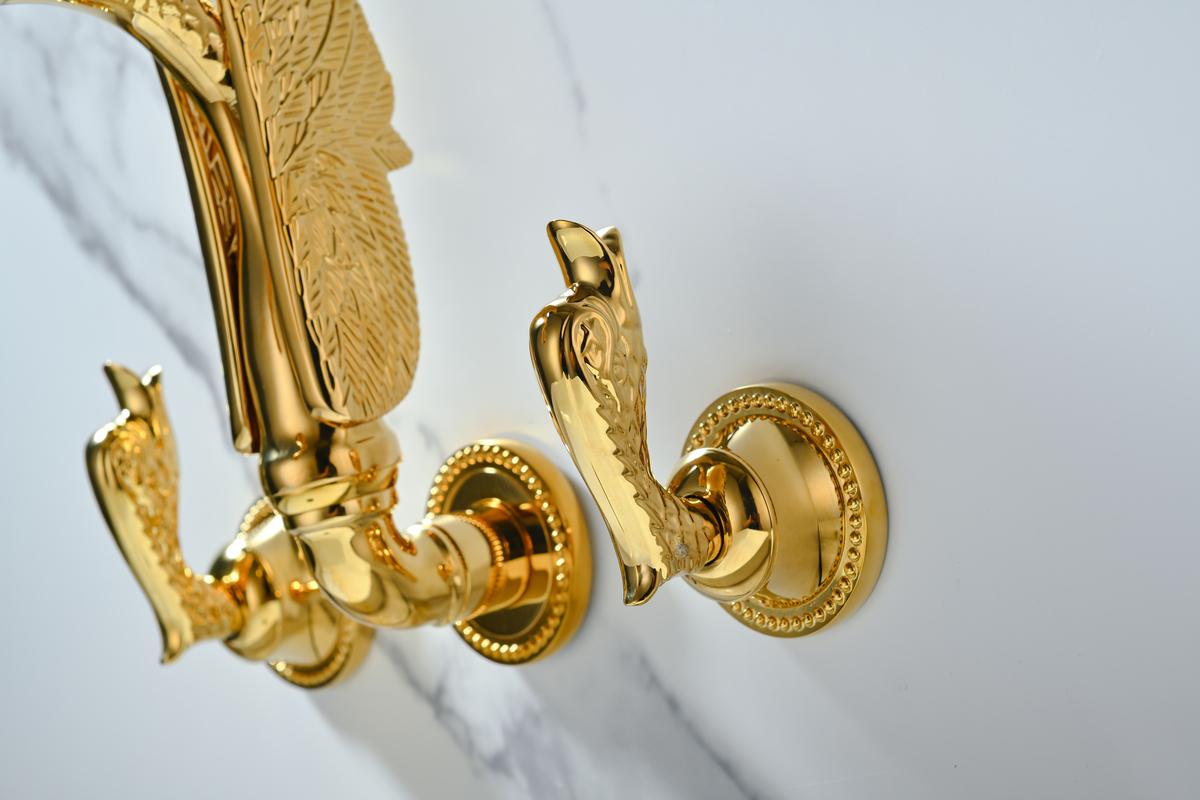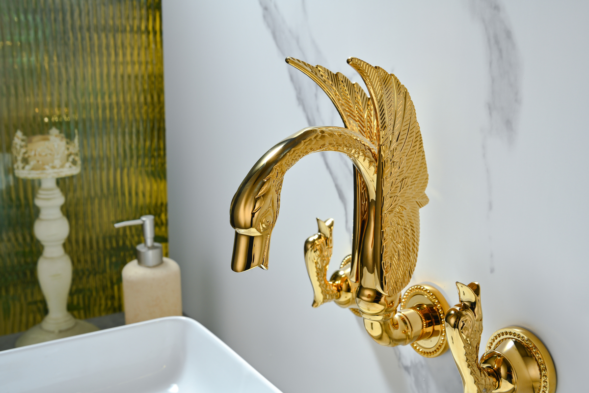 High-end Luxury Titanium Gold Wall-mounted Bathroom Faucet Swan-inspired Artistic Design Basin mixer Tap Concealed Solid Brass