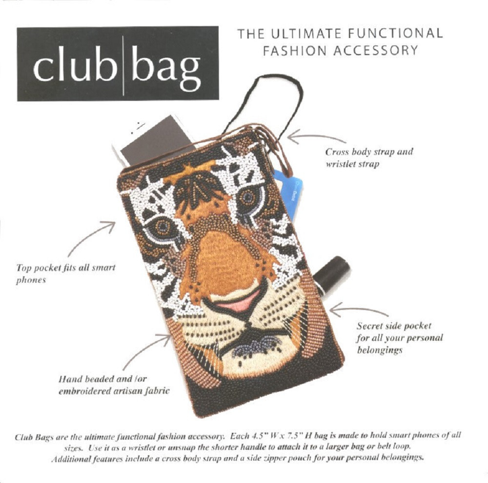 The Club Bag holds your essentials in style! Hand beaded by artisans in India, this versatile smartphone bag can be worn cross body or as a wristlet. Includes 48" cross body strap that can tuck inside when not in use, the short strap unsnaps so the bag can be attached to a larger bag or belt, and secure side zip pocket for cash and credit cards.