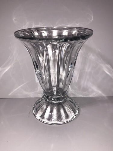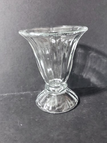This vintage set of 4 clear glass tulip ice cream sundae parfait dessert cups stands at 5 inches tall with a diameter of 4 inches. The traditional vintage soda fountain dessert cups feature a round shape and a single compartment, perfect for serving ice cream sundaes in a retro style. Made of glass with a clear glass gloss finish, these American-themed dessert cups were produced in the United States using heavy pressed glass techniques. The unmarked cups have a capacity of 6 fl oz and are a charming addition to any dinnerware collection.