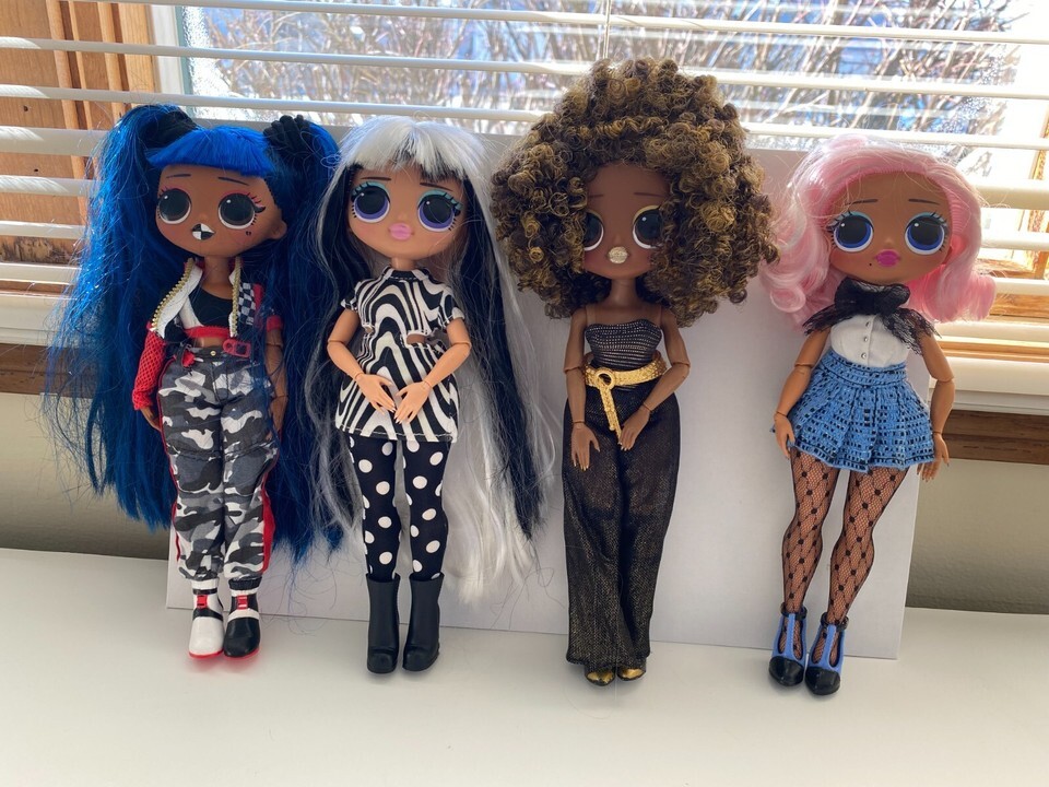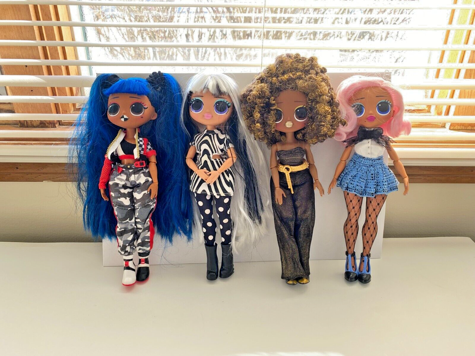 LOL Surprise OMG Lot of 4 Dolls Complete w/ Original Clothes and Shoes, 9" Tall. All marked MGA 2019 China. The dolls included are, from left to right: Downtown BB, Groovy Babe, Royal Bee, and Uptown Girl (all with their original outfits).