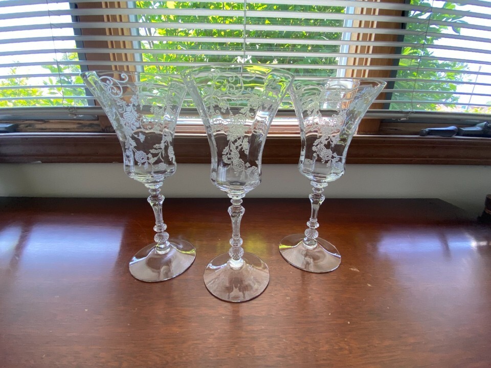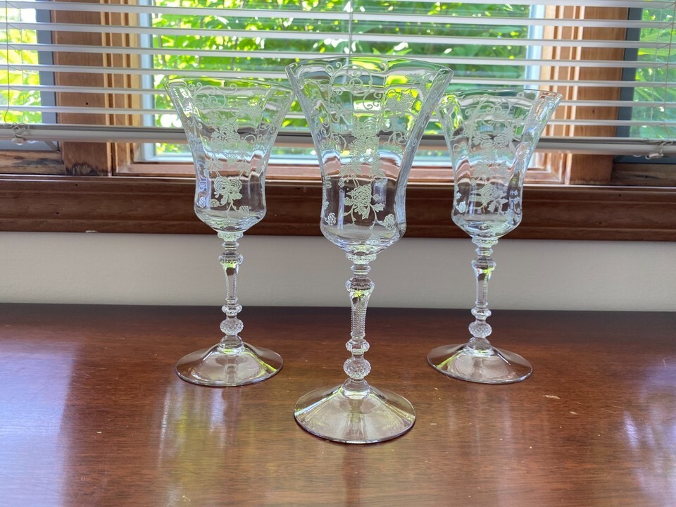 Cambridge Elaine Clear 3500 Stemware 9 oz. Long Bowl Water Goblets, Etched Floral Art Nouveau Elegant Pattern, Set of 3 Glasses. They measure approx. 8-3/8" in height and approx. 3-3/4" in diameter of the rim. Manufactured between 1933-1954 and Discontinued.