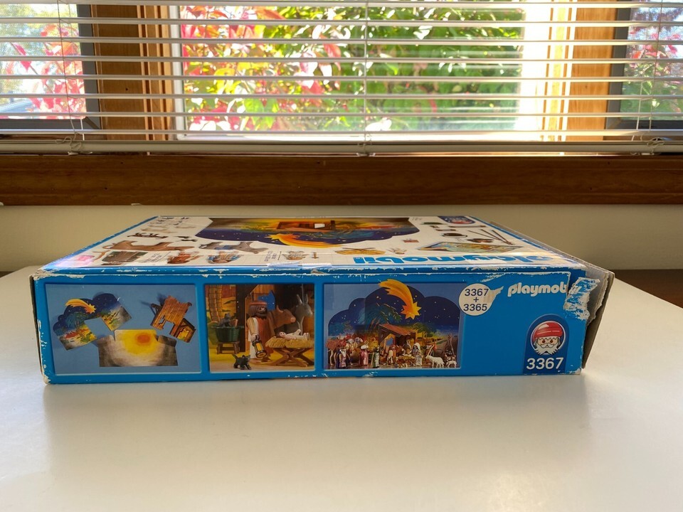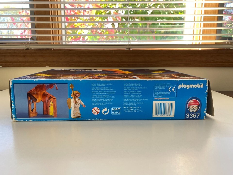 Vintage Playmobil 2001 Christmas Children’s Nativity Set 3367, Ages 4 and up. Included in this set are the following: Mary, Joseph, Baby Jesus, an Angel, a Shepard, a Donkey, a Cow, a Goat, 3 Sheep, a bed of hay, a lantern, 2 benches, a stick, a fire, a basket, 3 bundles of wood, 3 pieces of cardboard for the Stable and the ground setting, and a Story Book.