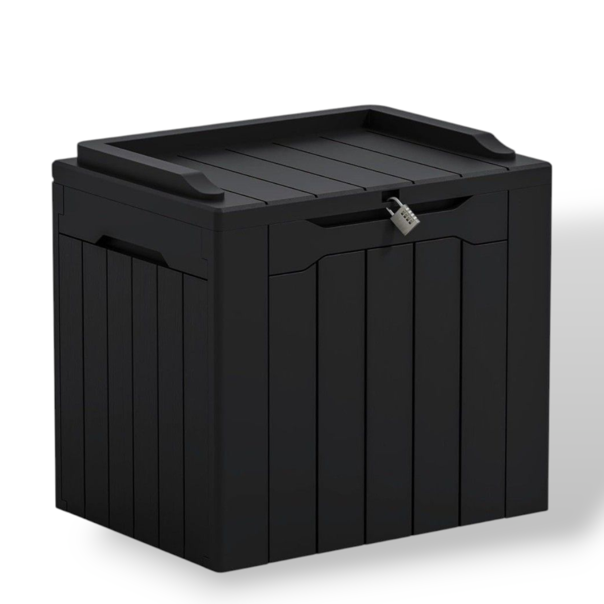 This extra-large capacity deck box (31 gallons) is ideal for keeping your patio, garden, poolside, and backyard neat and tidy. The lockable storage box features built-in hasps for a padlock (not included) and secure hydraulic lids for safe, easy opening. It?s multipurpose: use it for hidden outdoor storage, or as a weatherproof patio seat or side table (supports up to 1 adult).