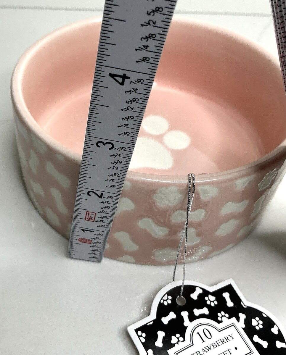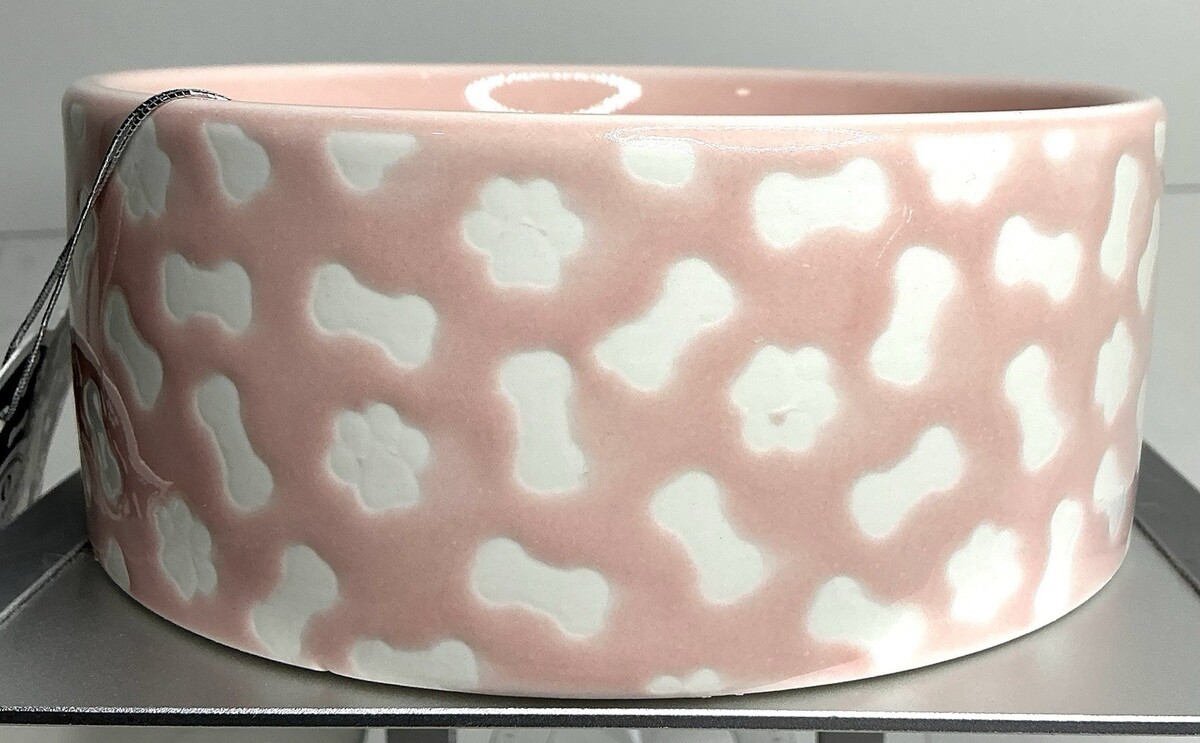 Stoneware Dog Bowl Pink Bones Paw Print 26oz Microwave Dishwasher Safe new