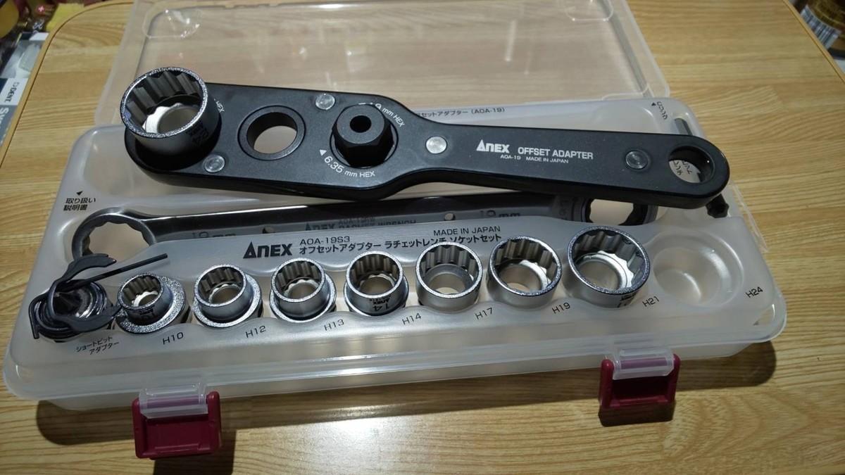 Set contents: 19mm offset adapter main body, ratchet wrench main body, short bit adapter (+) 2, sockets H10, H12, H13, H14, H17, H19, H21, H24,