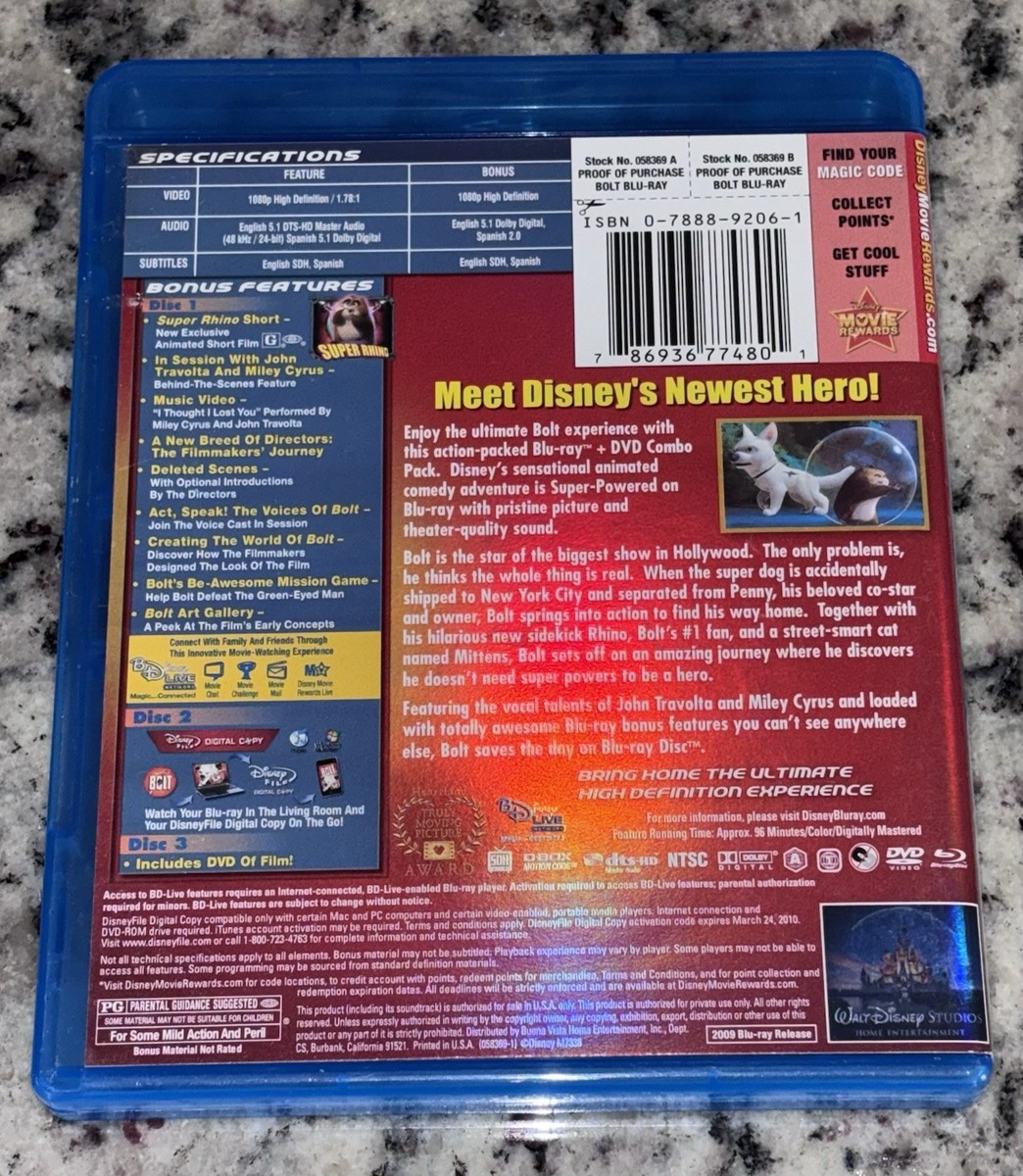 Bolt (Blu-ray Disc, 2009, With DisneyFile) Miley Cyrus, John Travolta