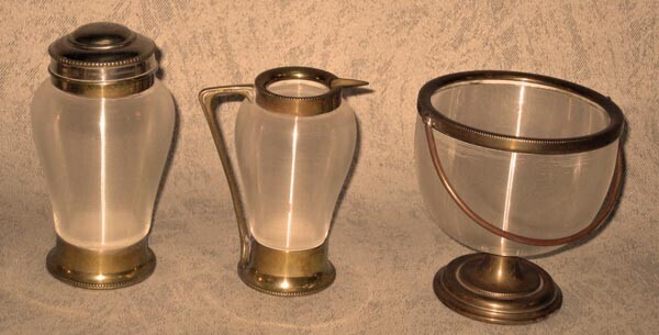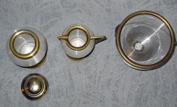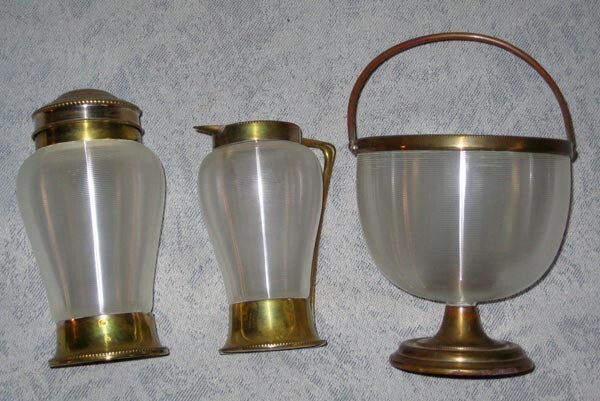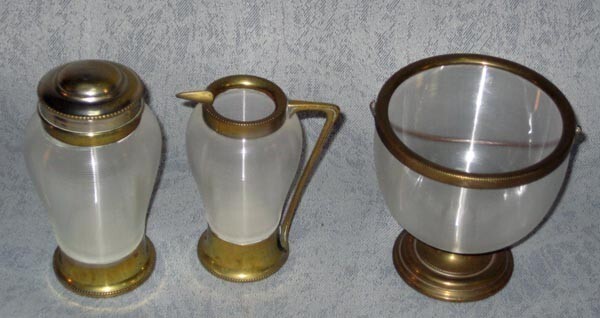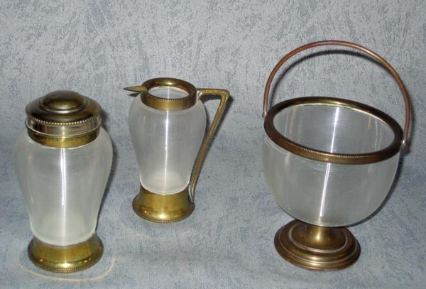 Antique Art Deco Ribbed Glass and Brass Cream & Sugar Dresser Dishes Set of 3