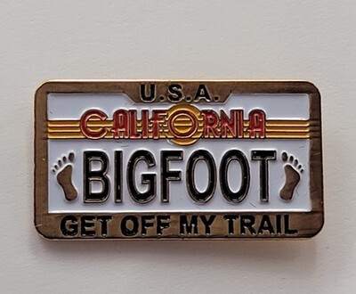 California Bigfoot License Plate Get Off My Trail USA Cryptid Humor Travel Pin
