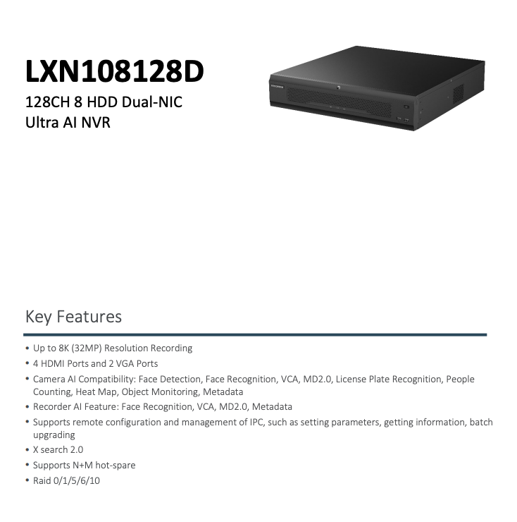 LXN108128D IP 16CH NVR 384 Mbps Up to 32MP 16 Port PoE 8K Ultra Intelligent NVR