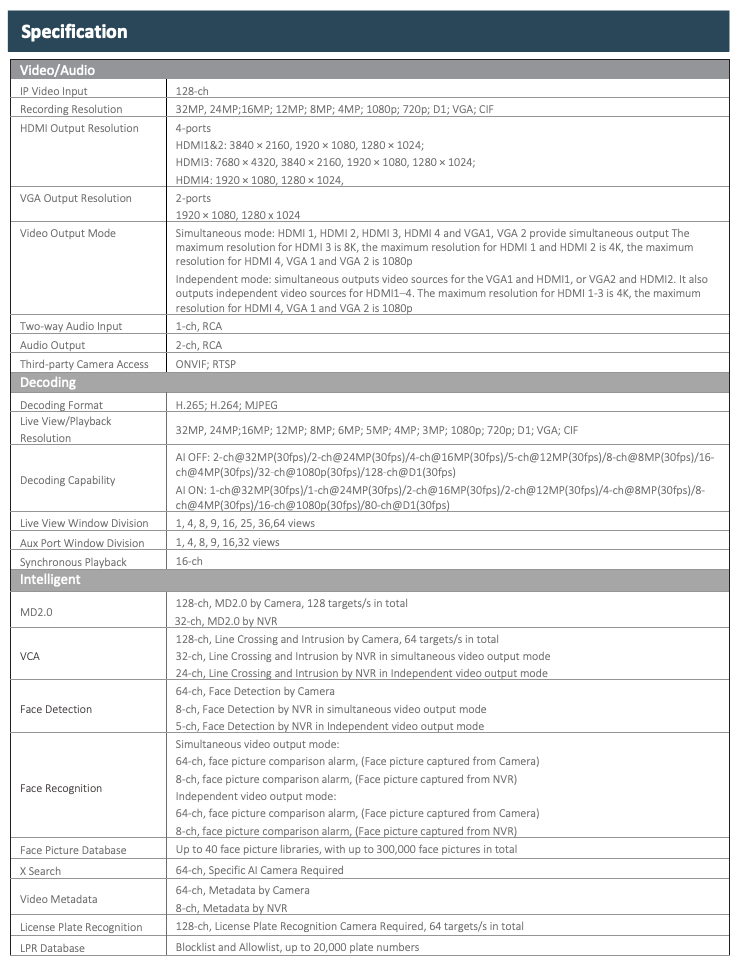Camera AI Compatibility: Face Detection, Face Recognition, VCA, MD2.0, License Plate Recognition, People Counting, Heat Map, Object Monitoring, Metadata