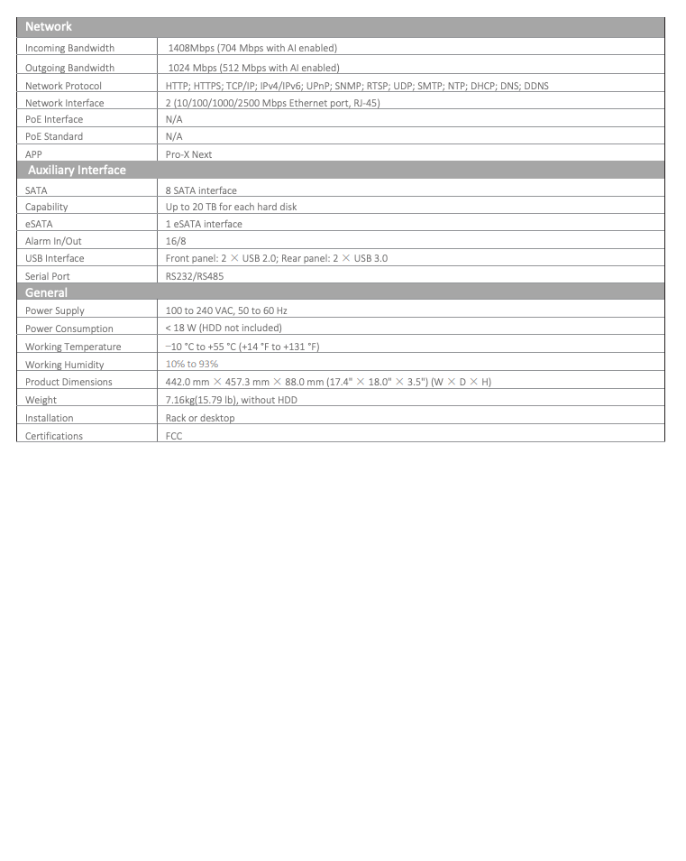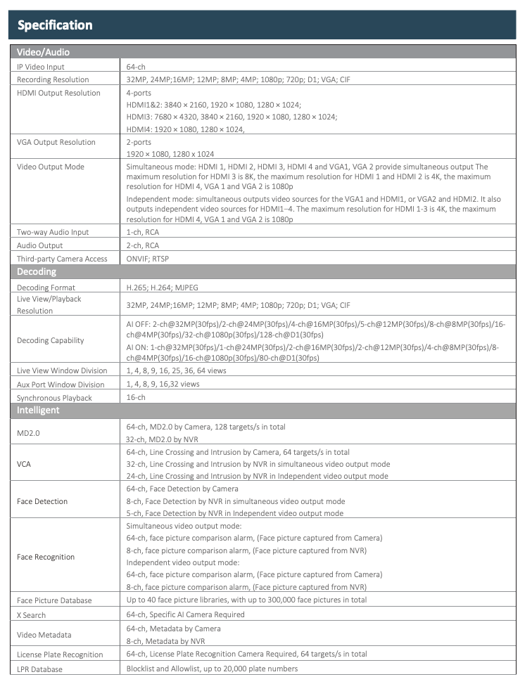 Camera AI Compatibility: Face Detection, Face Recognition, VCA, MD2.0, License Plate Recognition, People Counting, Heat Map, Object Monitoring, Metadata