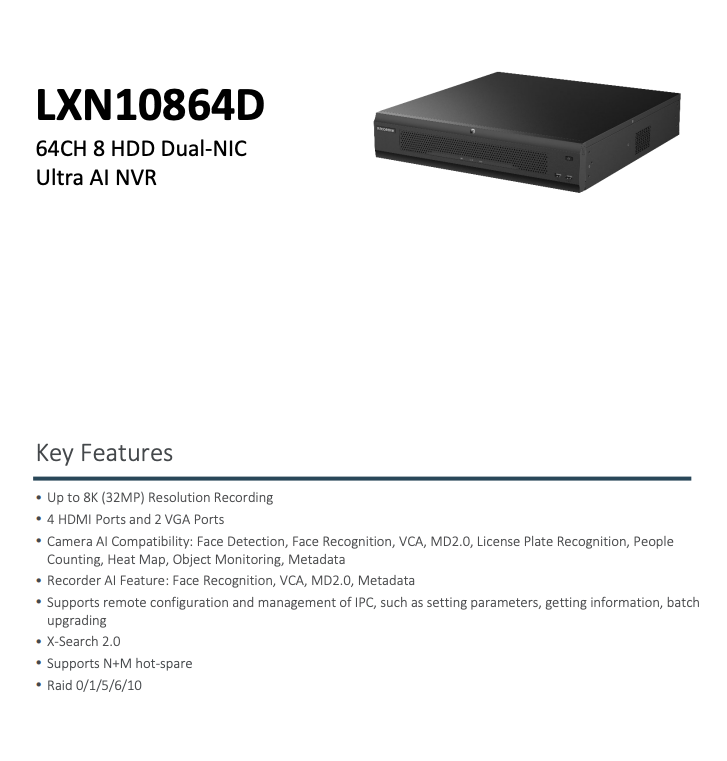 LXN10864D IP 64CH 1408Mbps Up to 8K/32MP 8xSATA 4xHDMI 2xVGA 2xLan Ultra Ai NVR