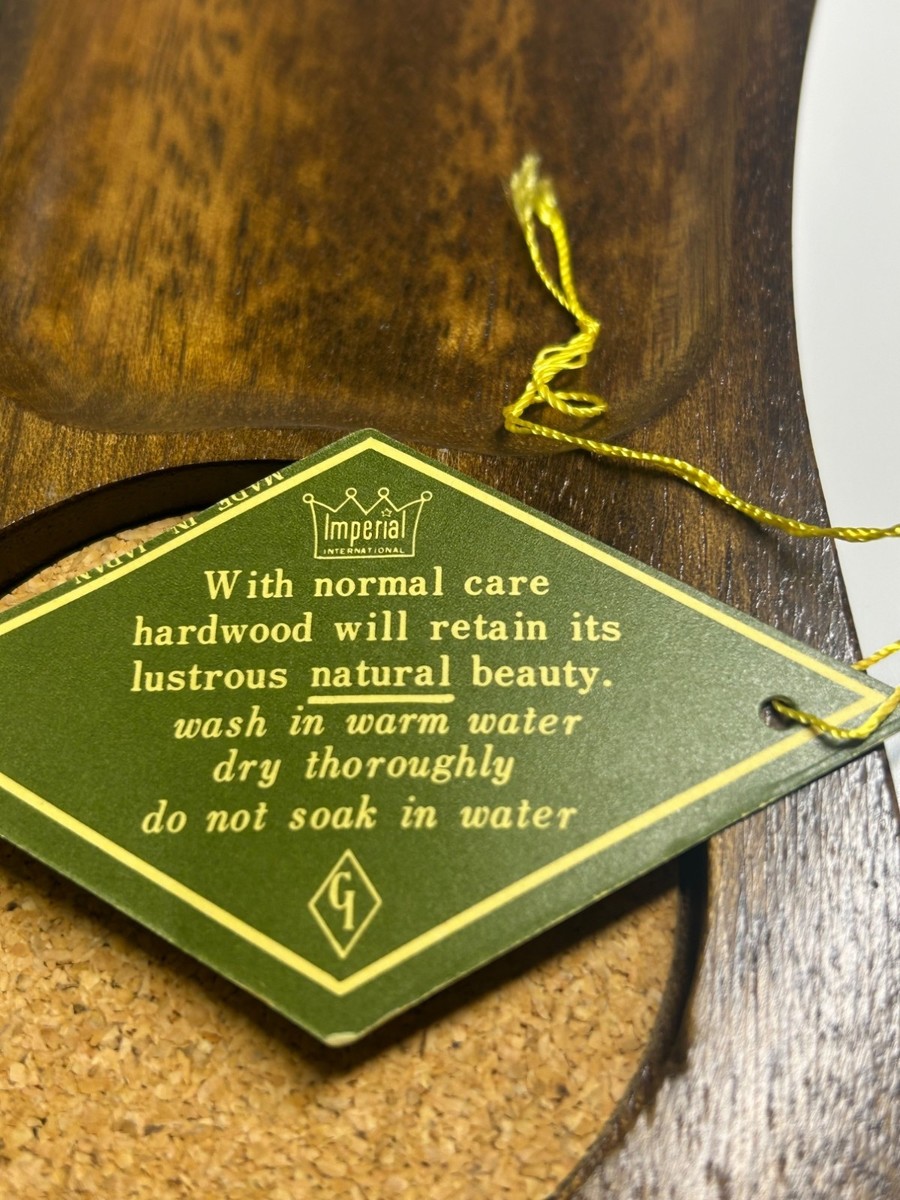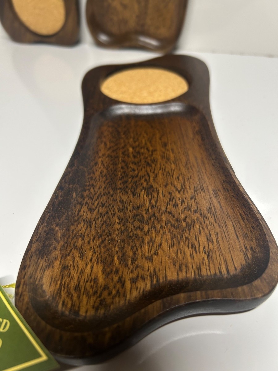 This mid-century 1960s set showcases hand-carved hardwood craftsmanship with rich tones and cork insets. A practical yet stylish addition to retro decor. Items have never been removed from the box except for pictures.
