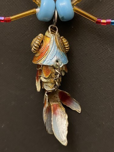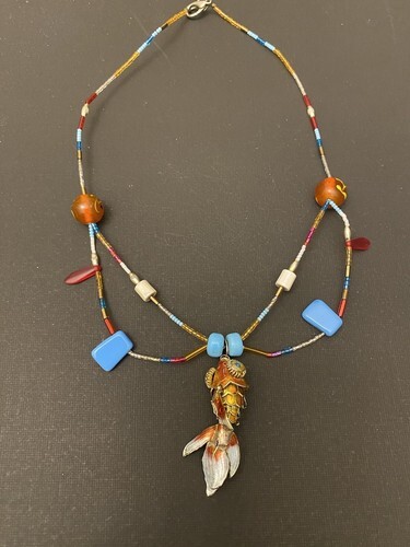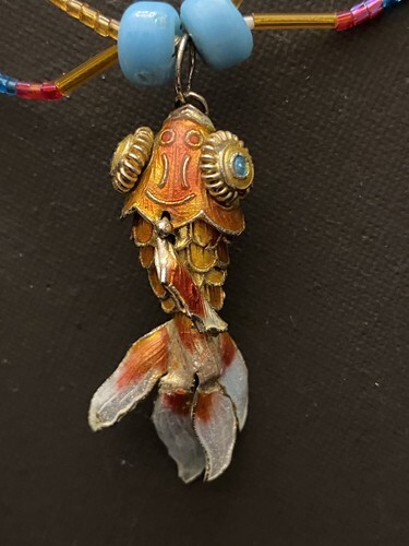 This is a lovely and colorful articulated Koi fish pendant in Cloisonne style on a glass beaded necklace. The fish measures 2? . The necklace is 17? long.