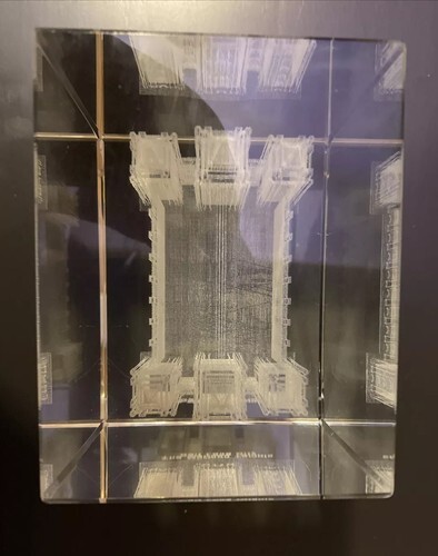 This is a very nice architectural 3-D etching. The cube is very heavy and believed to be crystal with internal etching so that it makes a lovely scene no matter from which side it is viewed. On one end, there is the label of the Mormon Temple in St. Louis.