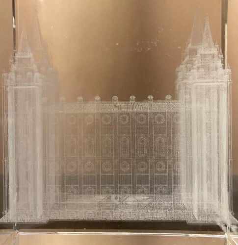 Crystal cube paperweight 3-D Etched Mormon Temple St. Louis.