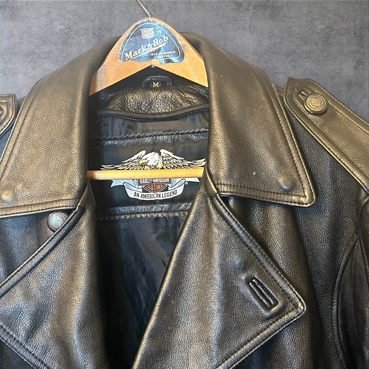 This Harley-Davidson jacket exudes timeless appeal, crafted from high-quality black leather. Its double-breasted design and embossed logo marry sophistication with rugged durability. The medium size offers a tailored fit suitable for riders or for casual wear, while its 3/4 length ensures extra coverage and style. Ideal for colder seasons or urban settings.