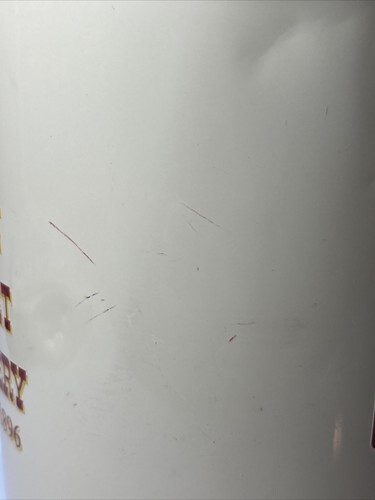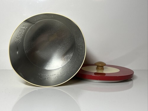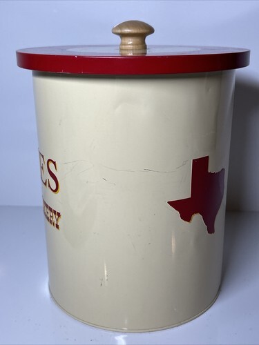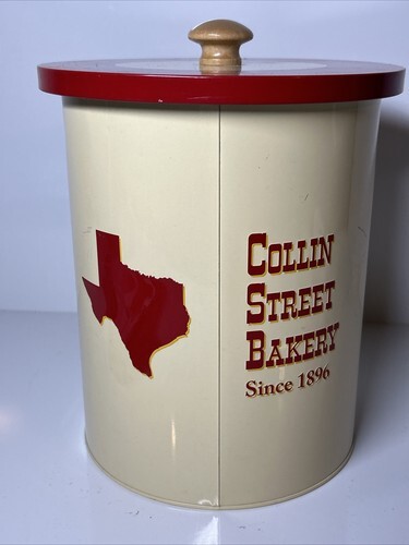 This vintage kitchen cookie jar tin from Collin Street Bakery is a must-have for any collector or lover of unique merchandise. Measuring 7" wide with a 1" lid overlap and standing at 9 1/4" tall, this red and beige tin container is perfect for storing your favorite treats. The jar is equipped with a knob handle that adds to its charming design.