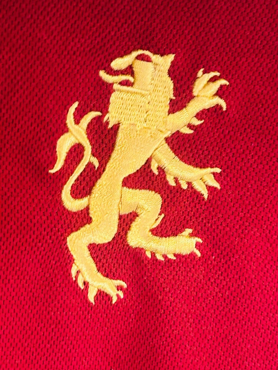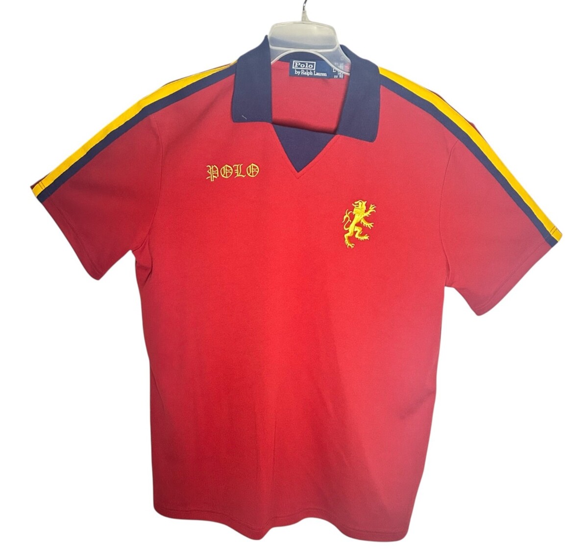 Polo Ralph Lauren Mens Red Polo Shirt W/ Yellow Lion Embroidery & Striped Should
