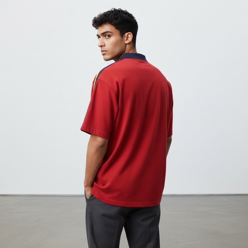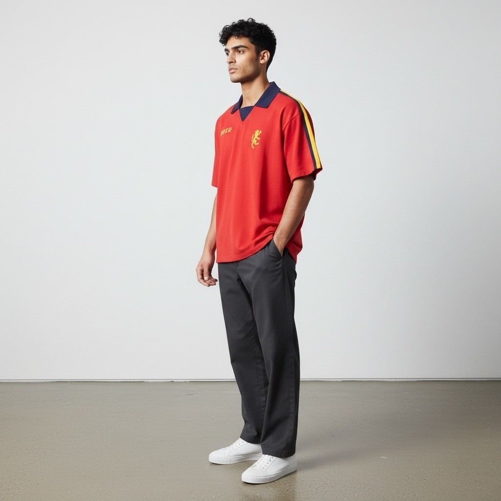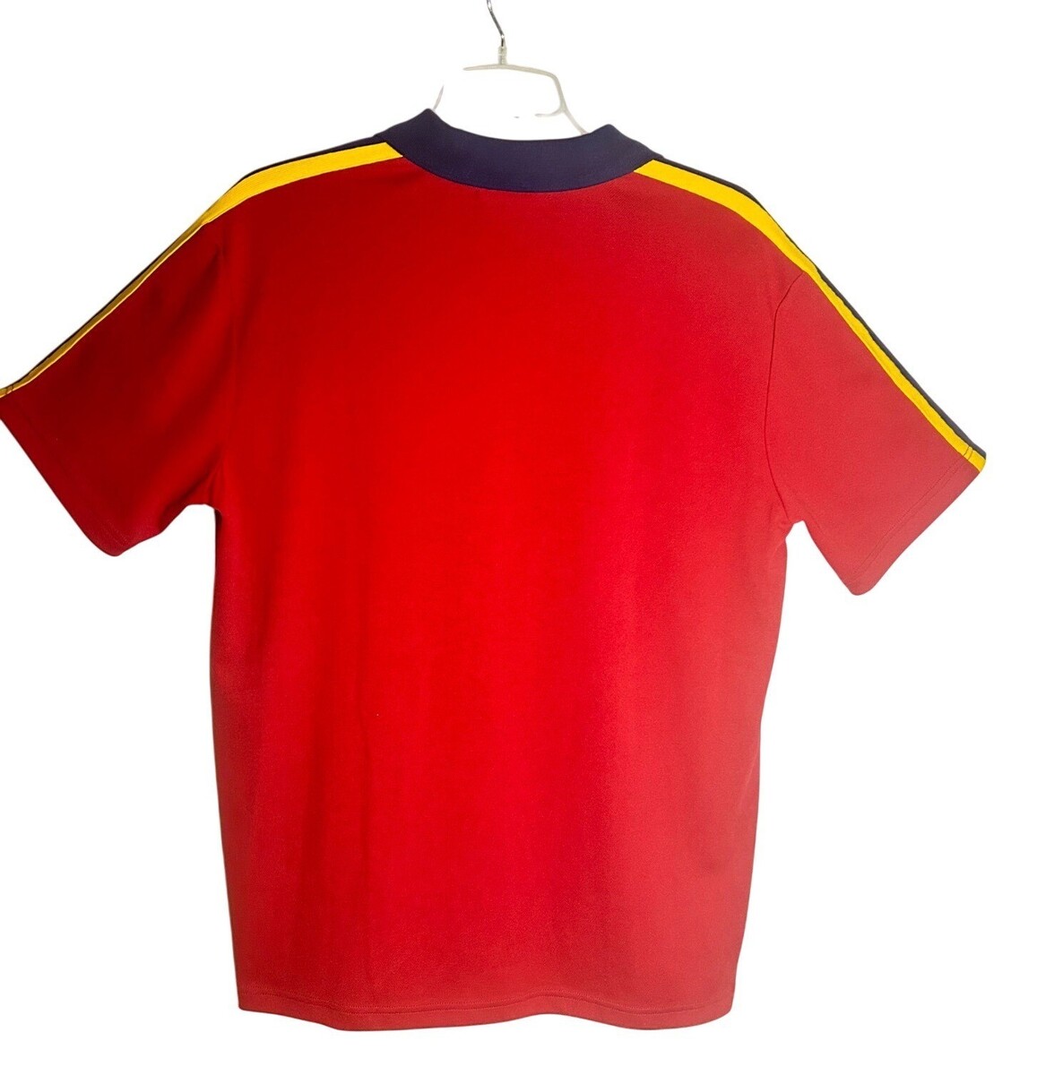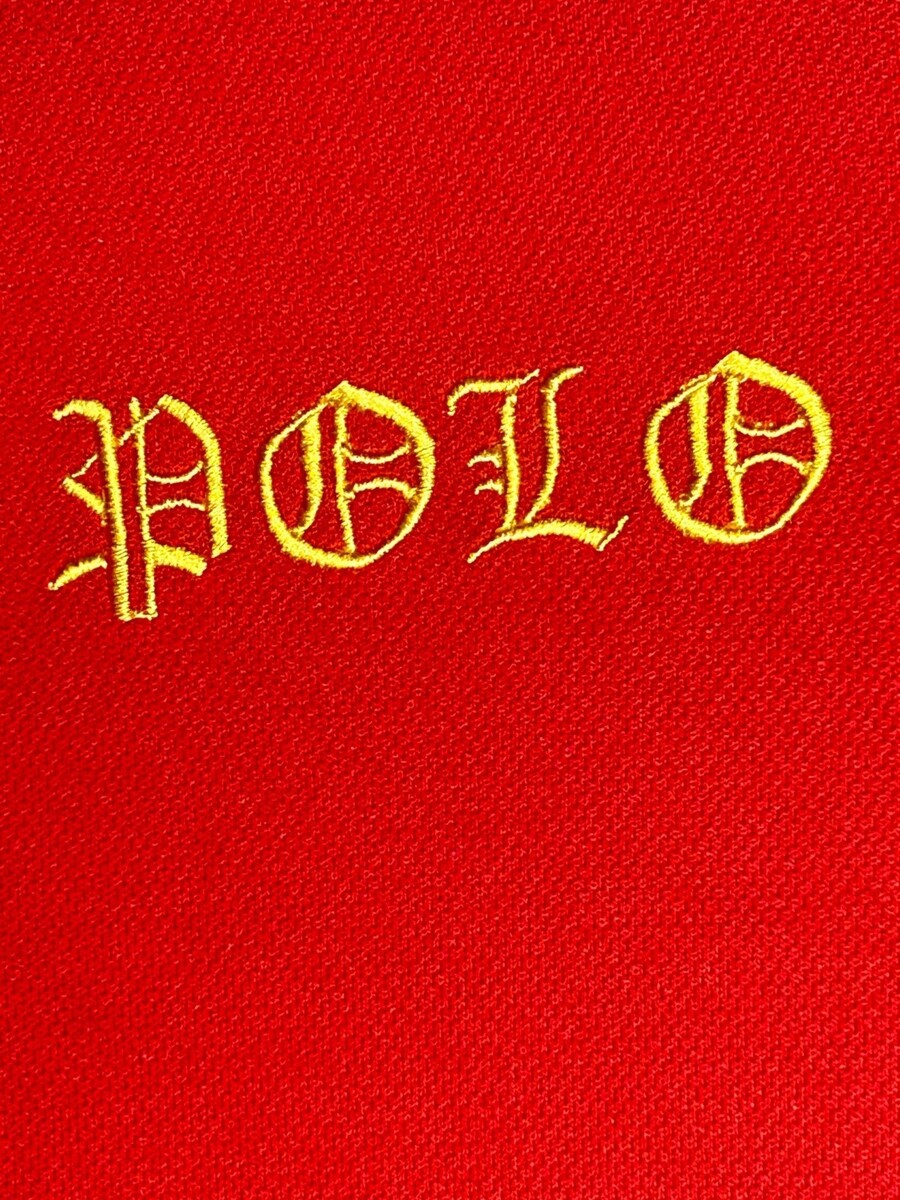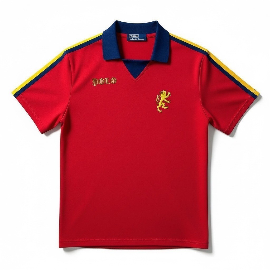 This vintage Polo Ralph Lauren jersey from the 1990s, features the brand's distinctive styling with a red body, navy blue collar, and yellow accent stripes. The jersey displays the word 'POLO' in gothic font embroidery along with a lion crest, both executed in gold thread, representing Ralph Lauren's equestrian and heraldic design. This sportswear polo exudes confidence and charm.