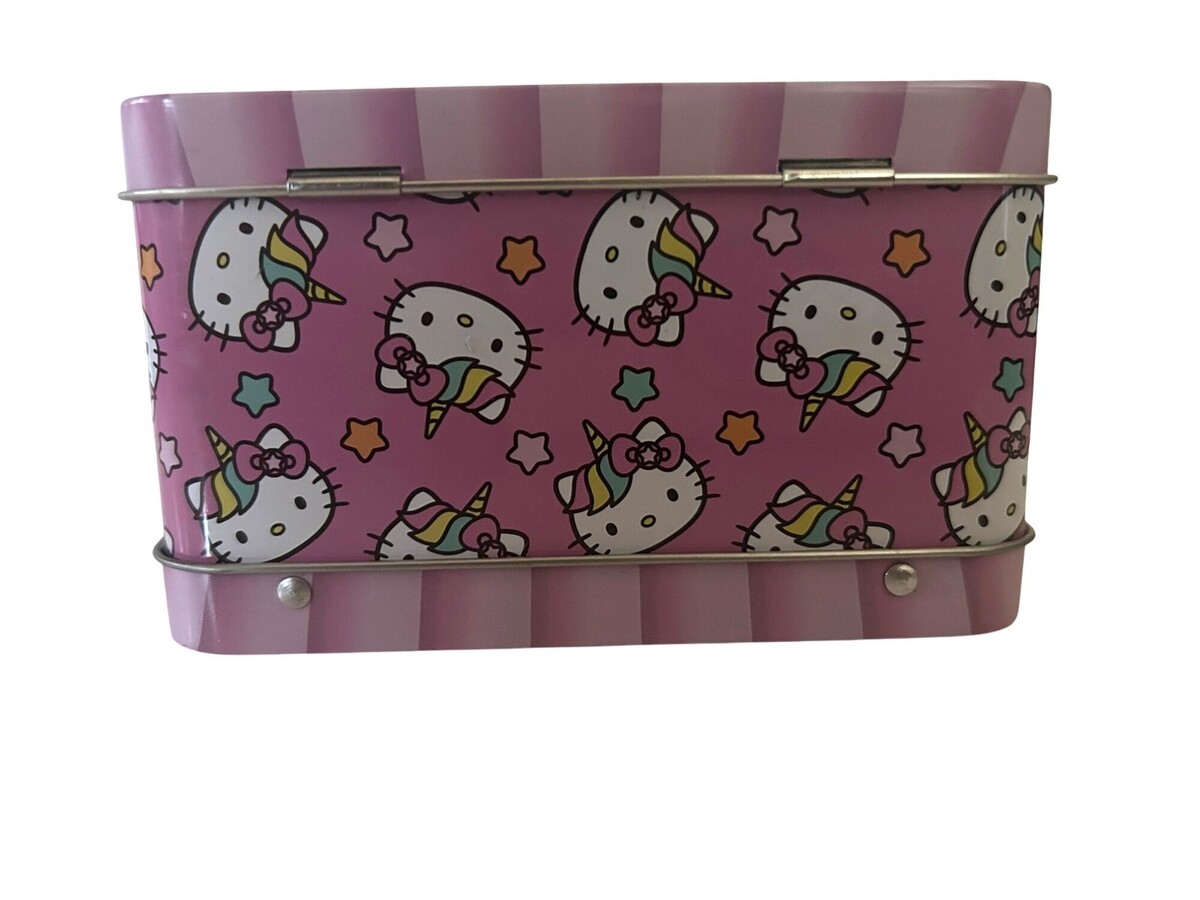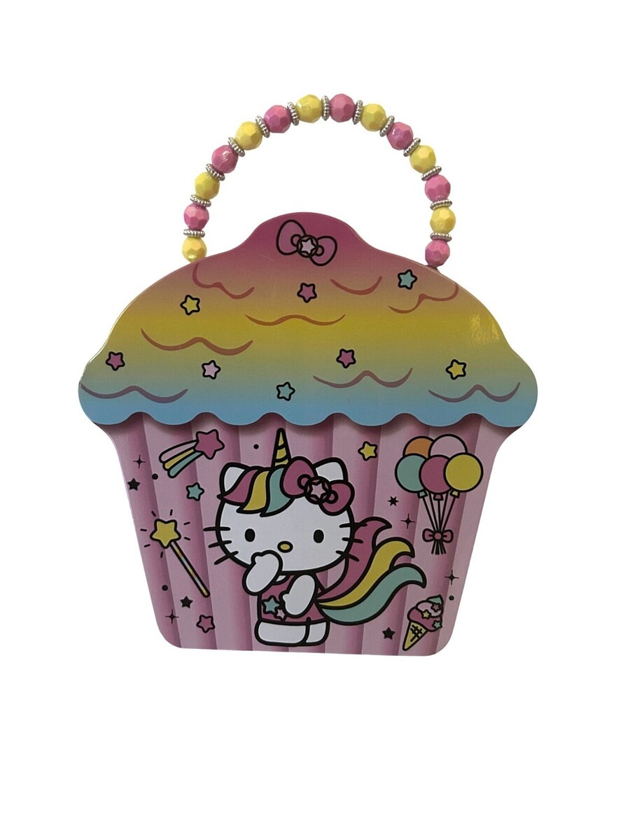 Hello Kitty Unicorn Cupcake Tin Box W/ Beaded Handle & Rainbow Design