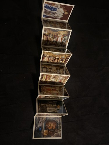 This souvenir is a rare and vintage item that contains 13 mini color photos of Schloss Linderhof. The photos are printed on glossy paper and mounted on cardboard. They show different views of the palace and its surroundings, such as the entrance, the fountain, the chapel, the Venus grotto, and more. The photos are in good condition, with some minor signs of wear and tear. The souvenir measures approximately 4 x 3 inches when folded.