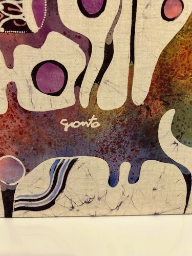 Measures approximately 37.5? inches in height and 27.5 inches in width x .75? deep (thickness of wooden frame upon which the fabric is affixed). This handmade piece is made in batik style on what appears to be cotton material. Since the piece is not glued to a board, but rather the edges of the material are just attached to the boards creating the edge frame, the piece could be used as a spectacular material. The piece is signed by the artist, Gianto. The figurative art style, folk / indigenous influences, and striking graphics make this a spectacular addition to any art collection. Whether you're a lover of Indonesian culture or simply appreciate unique and beautiful works of art, this batik wall art is sure to impress.
