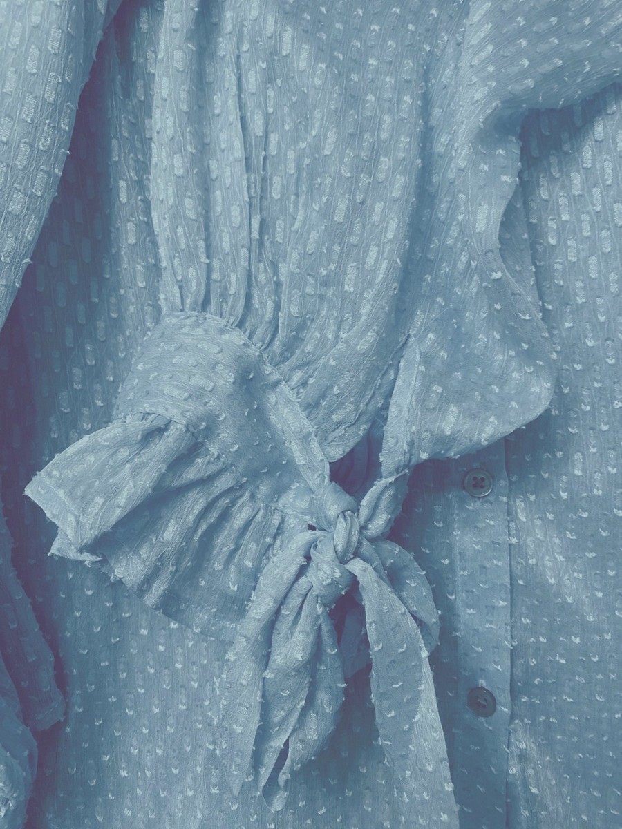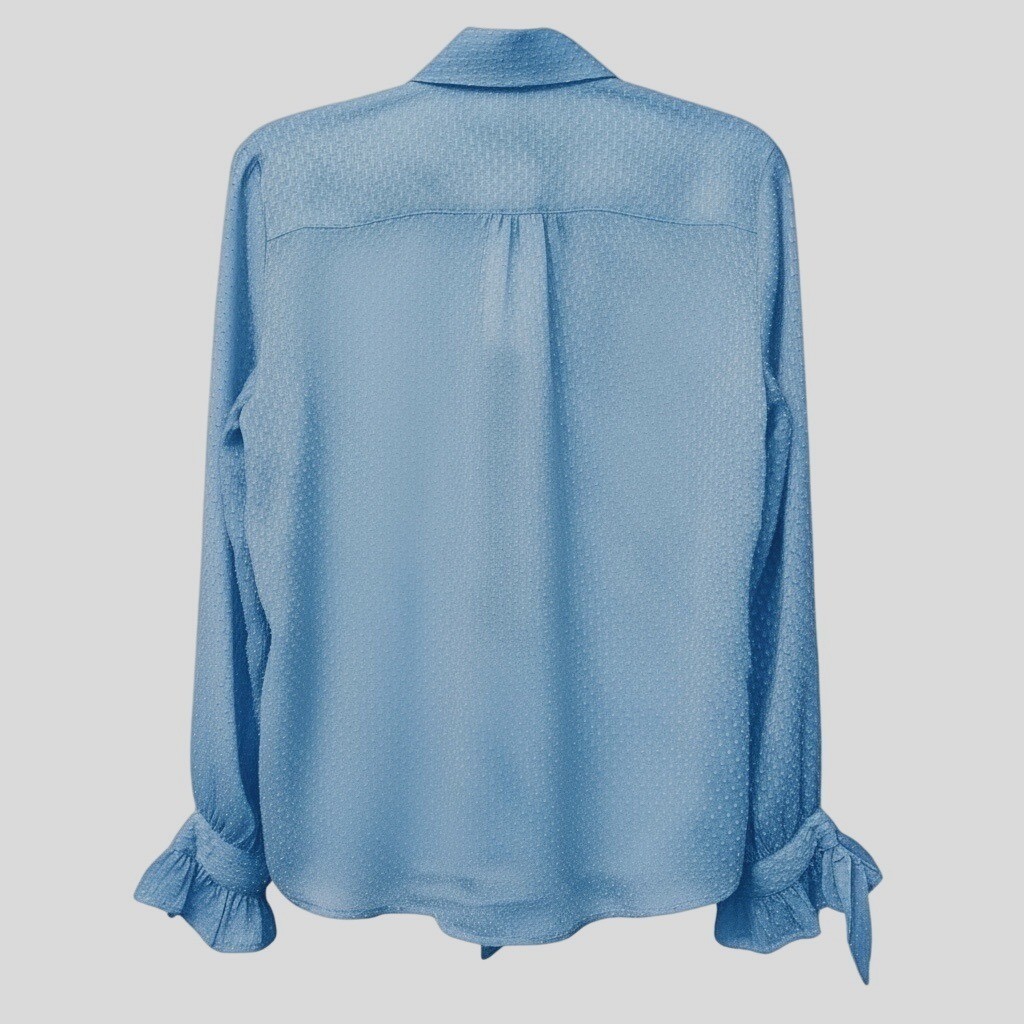 In a sunlit gallery with art adorning the walls, this blouse becomes an elegant companion. Its delicate texture whispers sophistication, while bow details at the neck and cuffs tell a story of refined grace. A piece that blends timeless charm with modern poise.