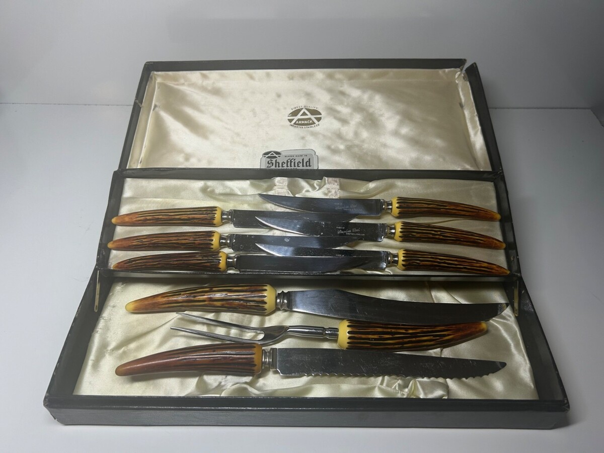 Sheffield Stainless Steel Knife Set Faux Stag Handles Orig. Satin-Lined Box VTG