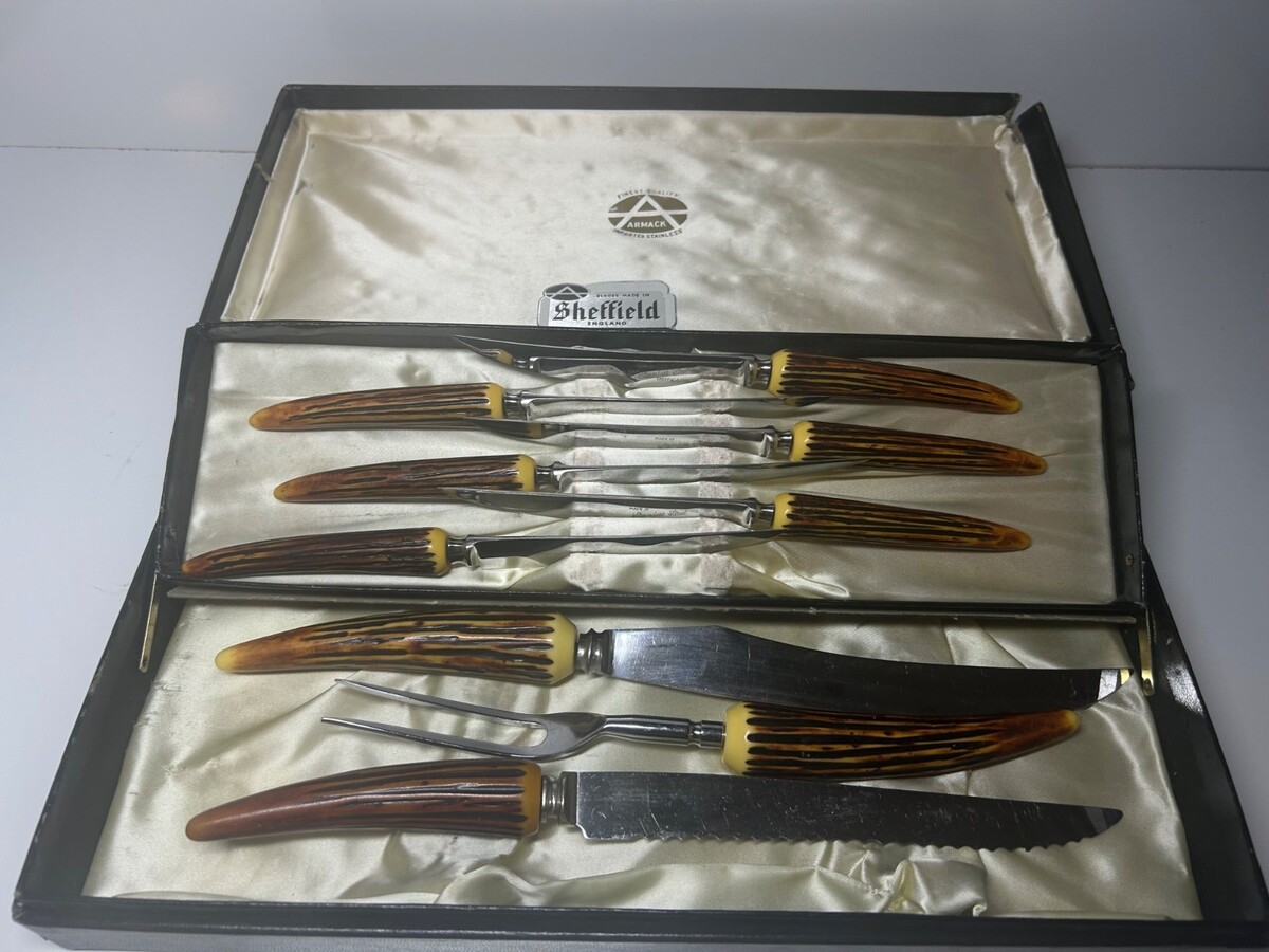 This vintage Sheffield stainless steel knife set features stunning faux stag handles and original satin-lined box. A timeless collector's item.