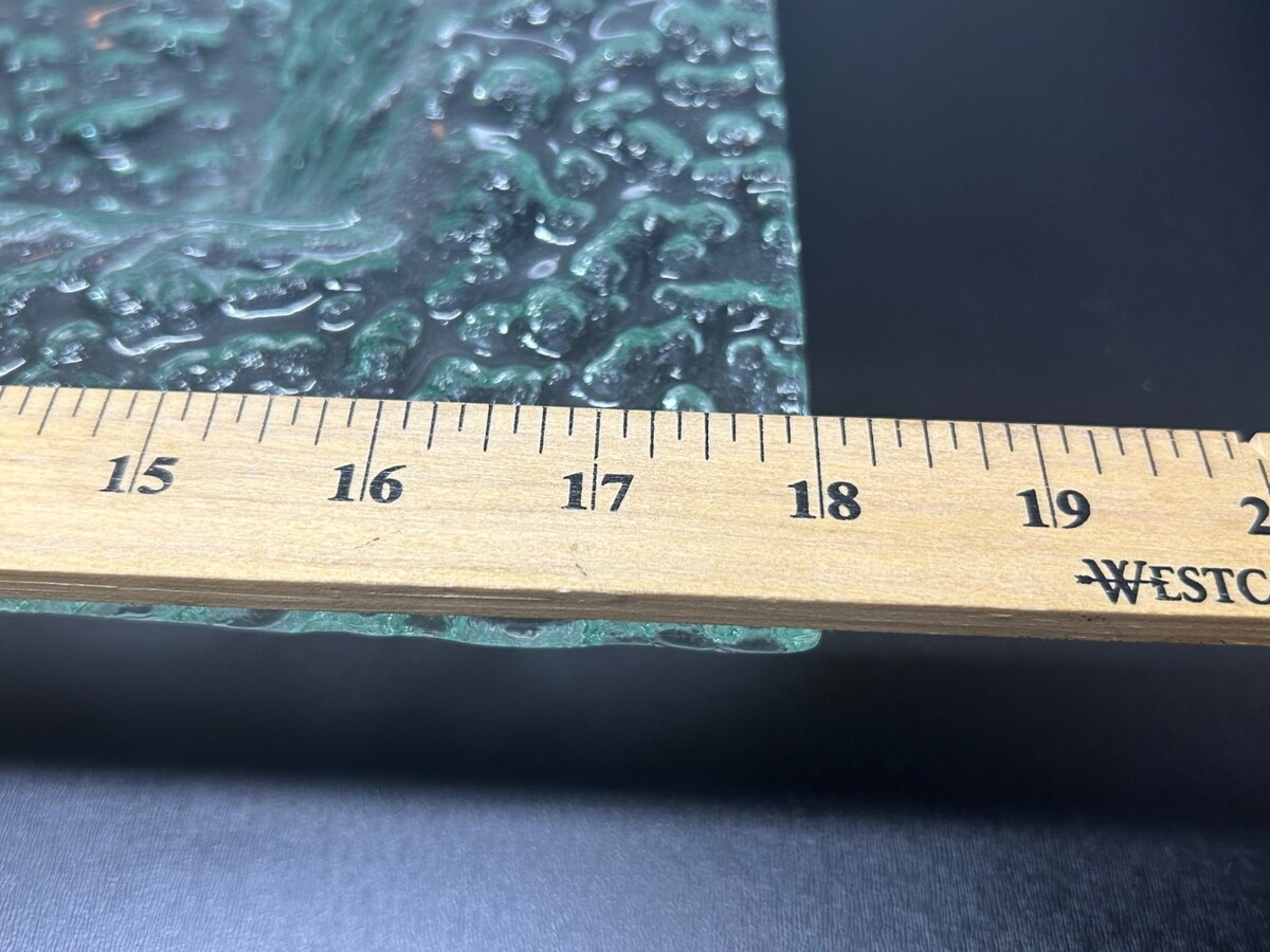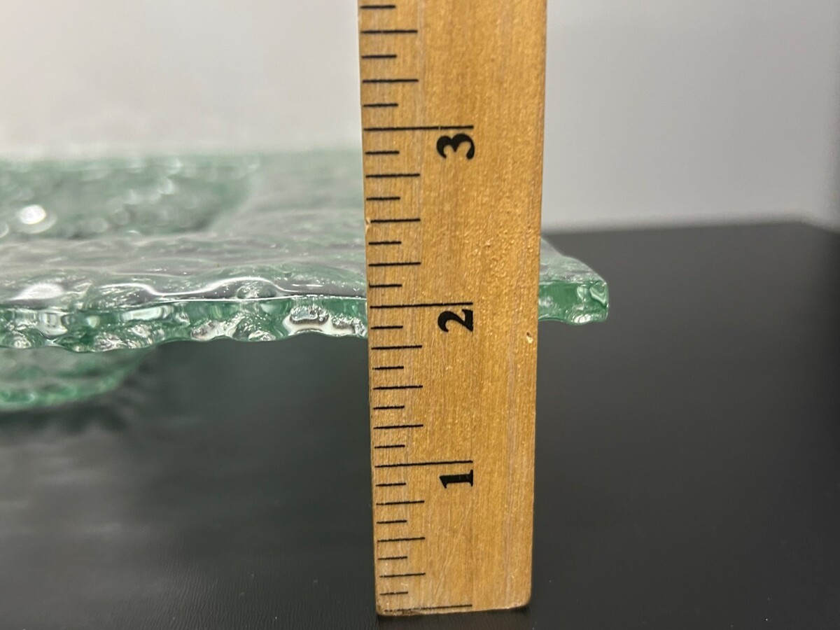 ? Approximately measures 18 x 13.5 x 2 inches deep. This piece is made of a very heavy glass.