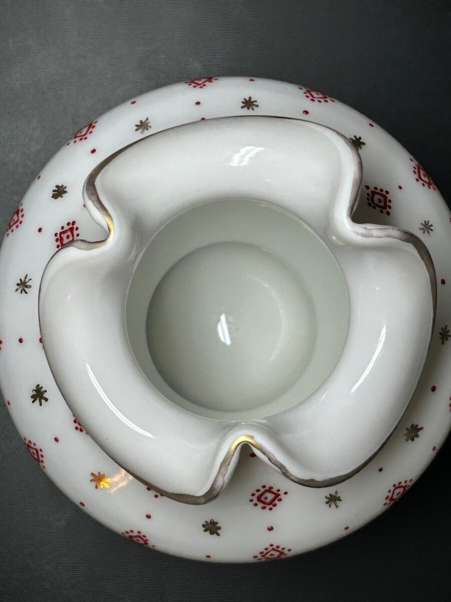 This vase is in excellent preowned condition with no damage (no cracks, chips, major scratches, etc.). There is some wear evidence in that the golden stripe on the ruffle and in a few other place on the vase are worn. Overall, in good condition for it's likely 70 plus year age.