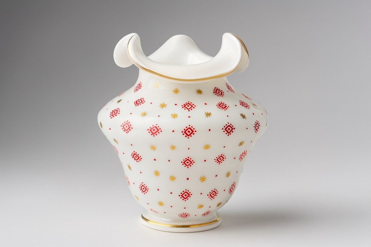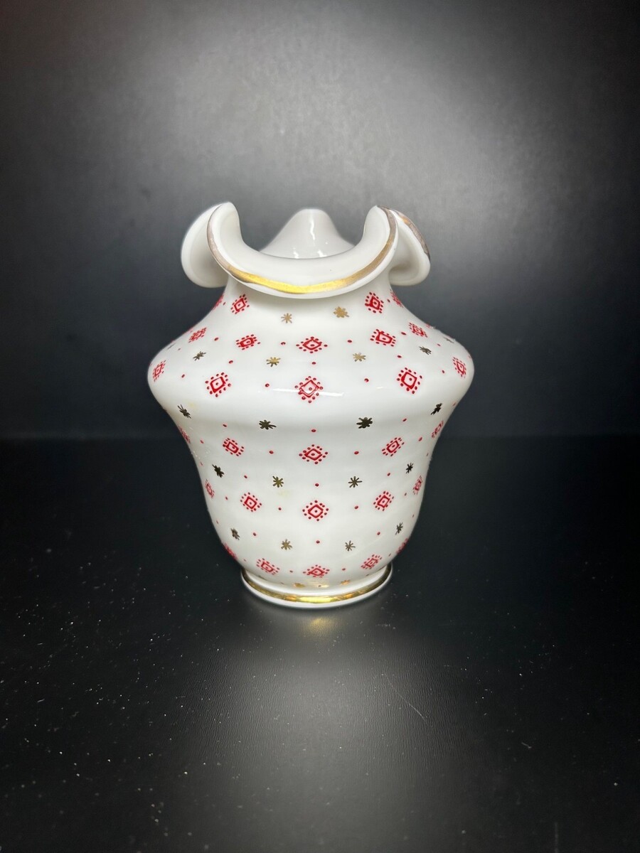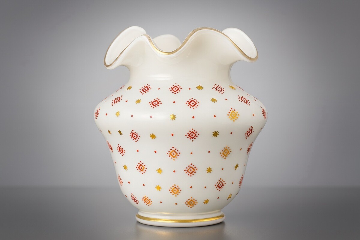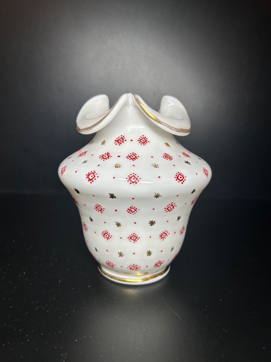 Fenton Charleton Vase Ruffled Gold Stripe Milk Glass Red Geometric Pattern 3001