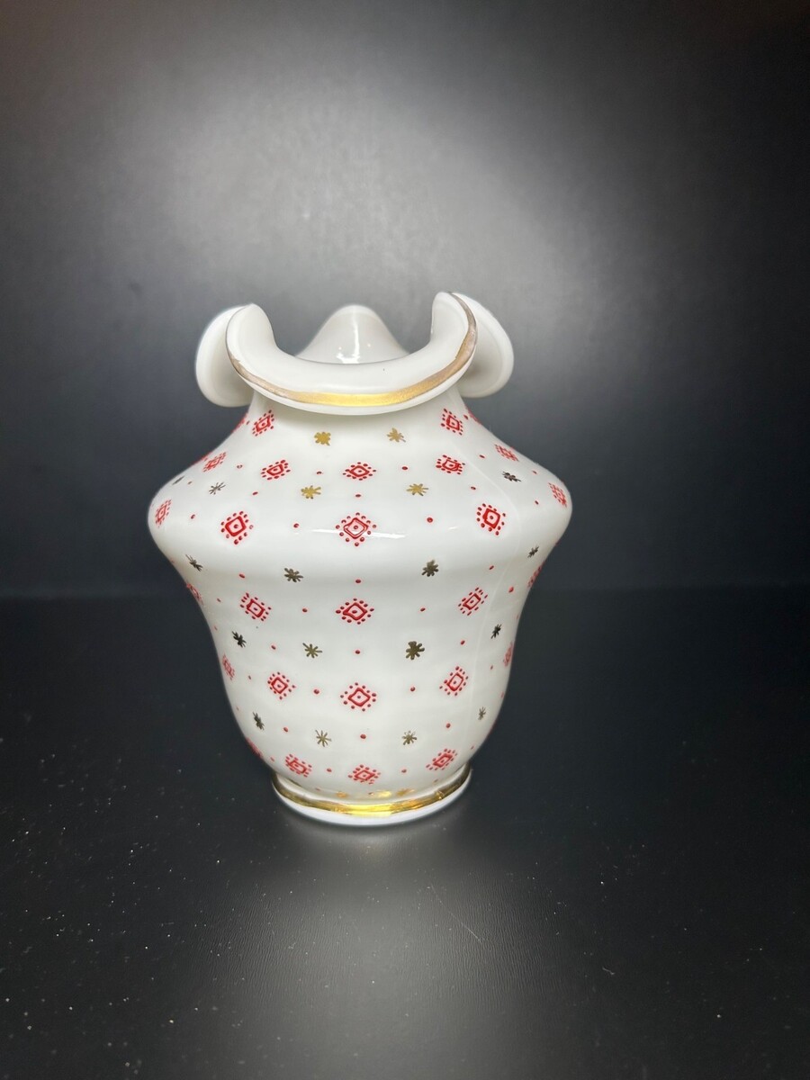 This elegant milk glass vase (mould #3001) from Fenton with a striking red and gold geometric pattern sometimes called Charleton Red Geometric is part of the Fenton Charleton Collection. We believe this pattern and piece type to be fairly rare and that it dates circa 1949-1954. Based upon a similar piece that have the initial sticker in place, this vase was likely decorated by the Abels, Wasserberg Co. (AWCO), who was a premier decorating company in the US during the 1940s and 1950s. These pieces were hand decorated in the AWCO NYC studio and were then fired for permanence.