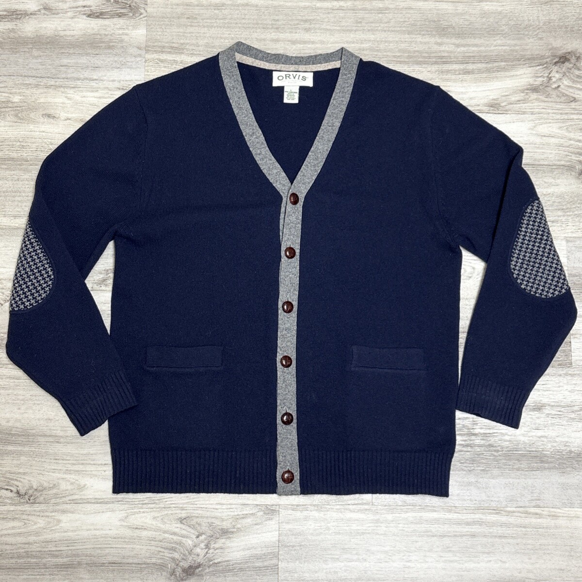 Orvis Lambswool Sweater Mens L Blue Gray Cardigan Elbow Patches Retro Grandpa