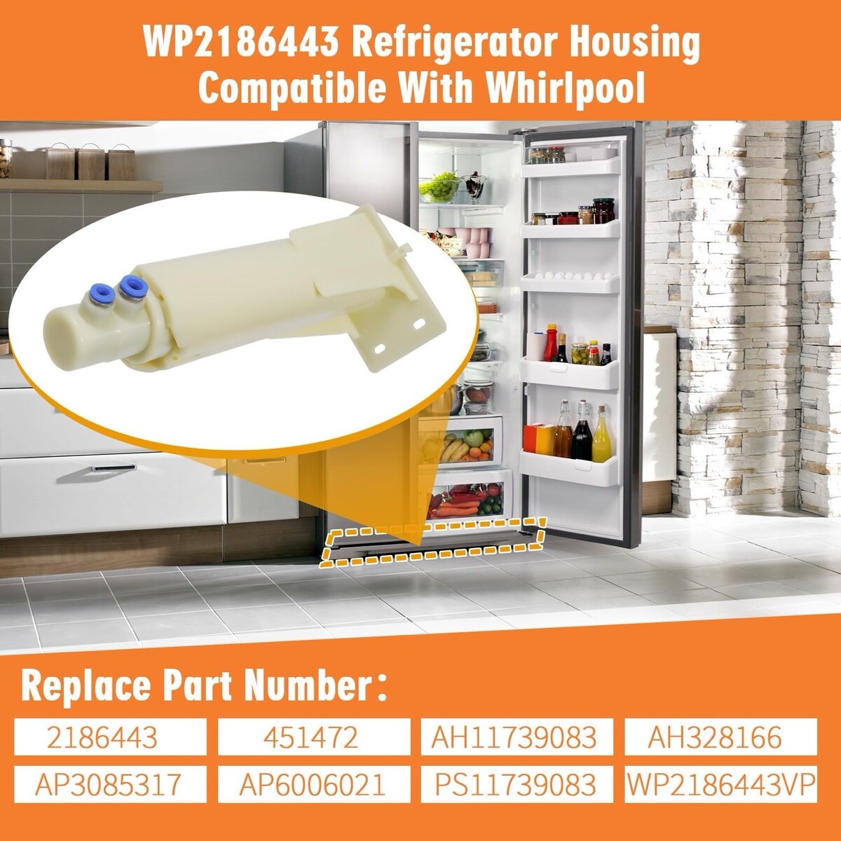 Replacement WP2186443 refrigerator water filter housing designed for select Whirlpool-built side-by-side refrigerators. This housing restores proper water filtration and helps resolve issues caused by cracked, leaking, or degraded original housings.