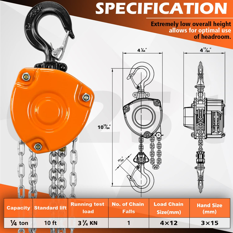 Color: Orange Material: Alloy Steel MAX Weight Capacity: 1/4 TON (250KG) MAX Lift: 10 FT No. of Chain Falls: 1 Load Chain Size(mm): 4.0 x 12 Hand Chain (mm): 3 x 1 5