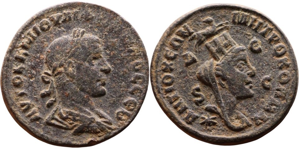 On the reverse appears the iconic bust of Tyche, the divine protectress of Antioch. Adorned with her towering mural crown, she embodies stability, fortune, and the enduring spirit of the great Syrian capital. Her presence elevates this coin beyond currency into sacred civic imagery.