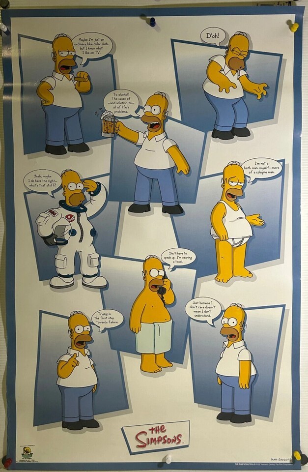 The product is a limited edition 22x34 poster featuring a quote collage of Homer Simpson from "The Simpsons" franchise. Produced in 2002 for Anime Expo, the glossy paper poster showcases the character Scorpio and is an original licensed reproduction. Made in the United States, this unique collectible item is a must-have for fans of the popular animated series.