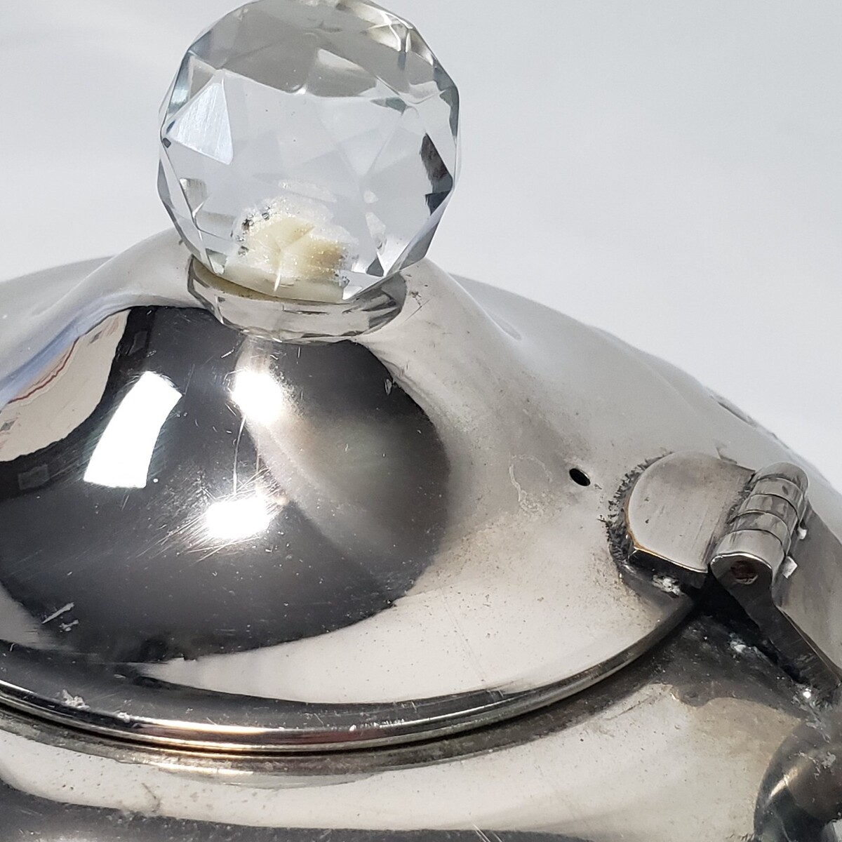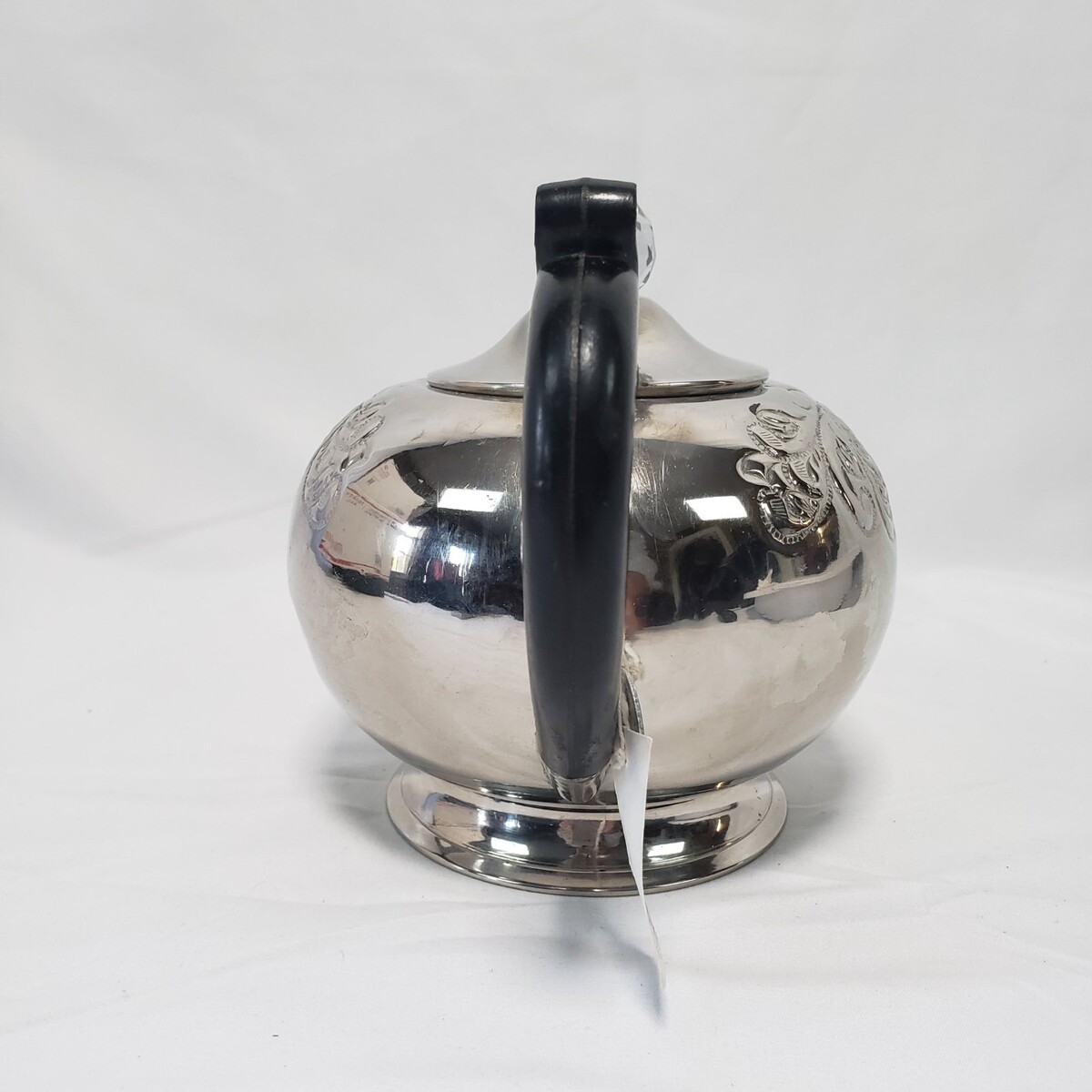 Teapot was never used. Original tags still attached. There are stains, tarnish and some flaking/peeling throughout including on the black plastic handle. There are a few dings/dents on the sides of the tea pot (as shown in the pictures). The faceted, round acrylic lid finial is intact and no chips, no cracks. Bottom of tea pot is tarnished and pitted. Teapot has overall oxidation and shelf-wear.