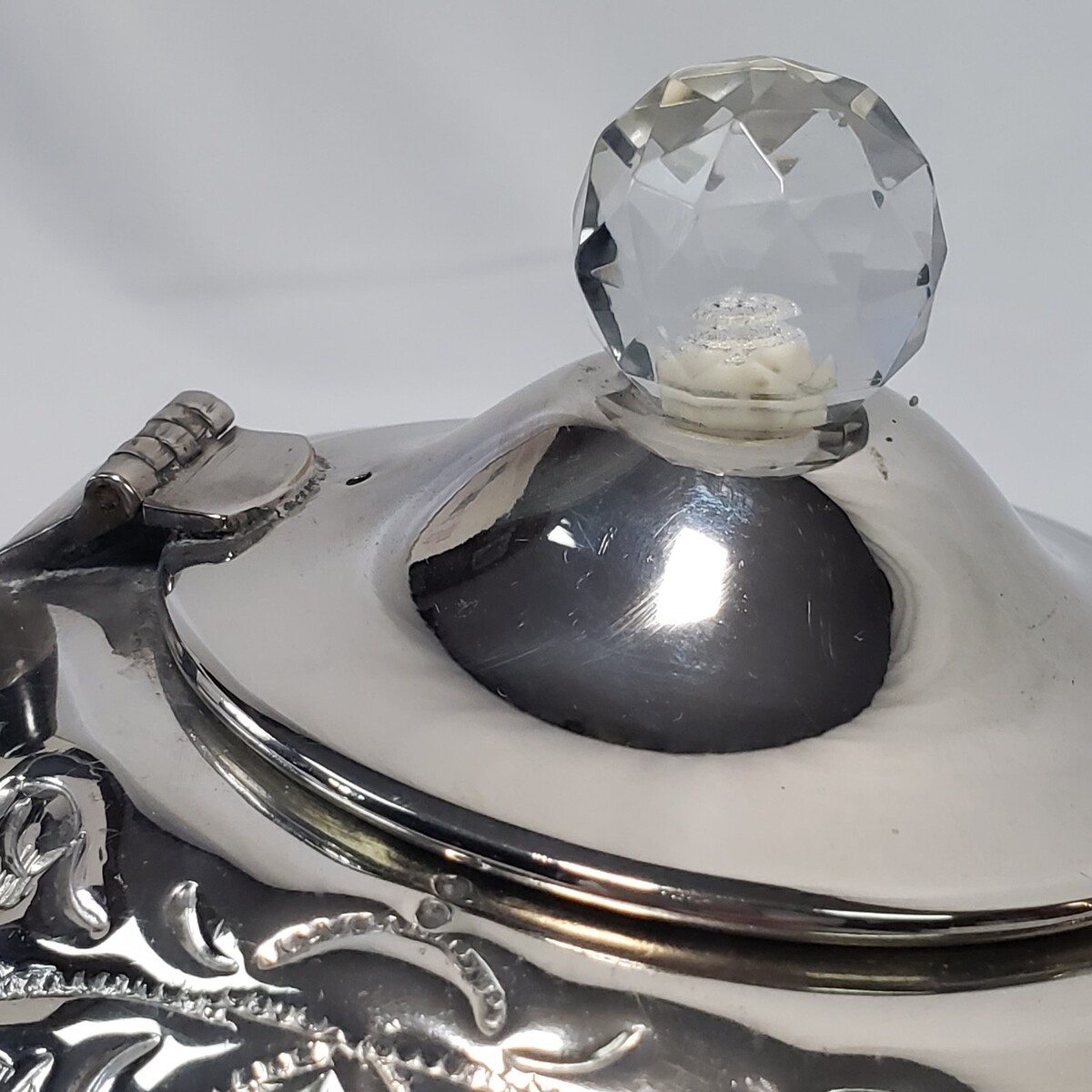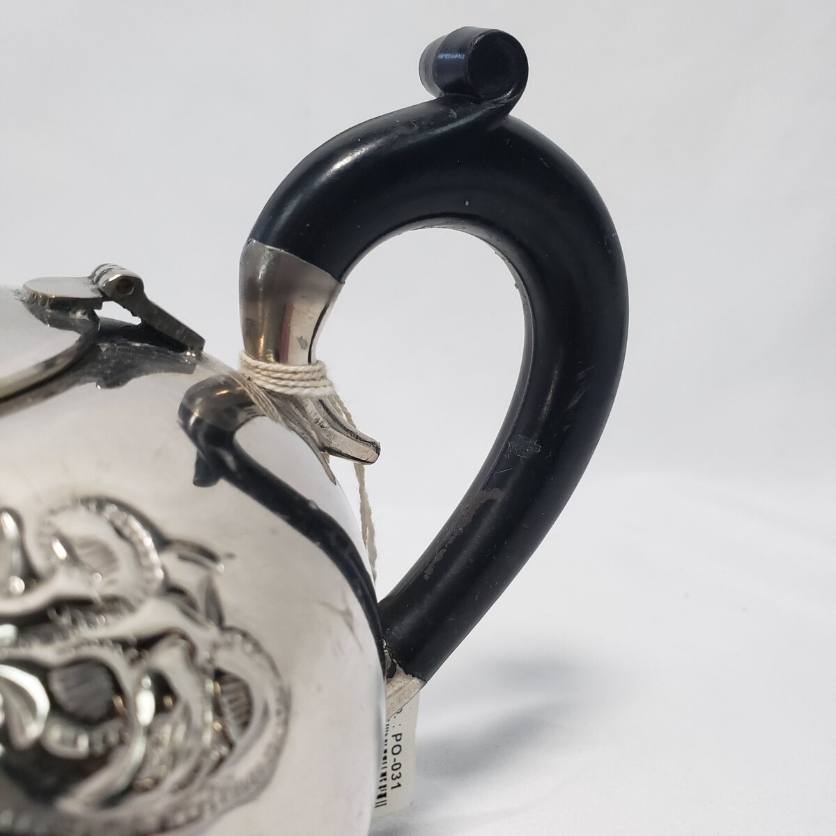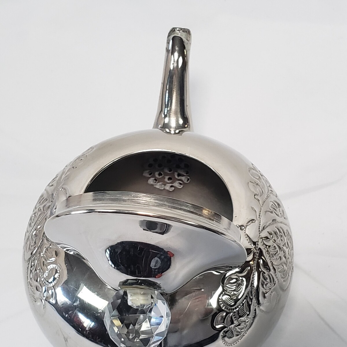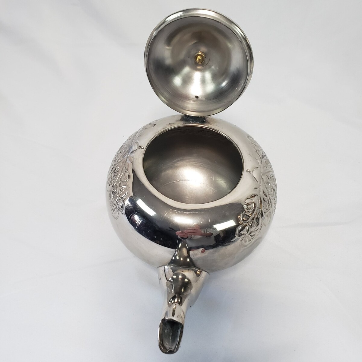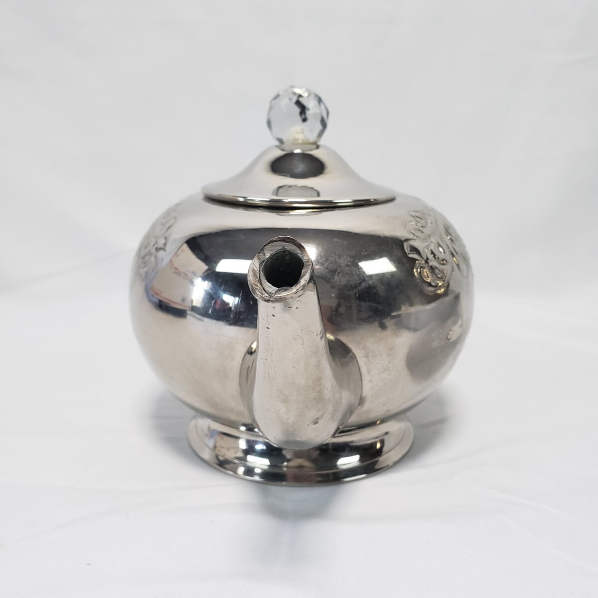 Decorative teapot seems to be brass nickel or chrome plated. The top-sides of the tea pot are embossed with a vintage style motif.