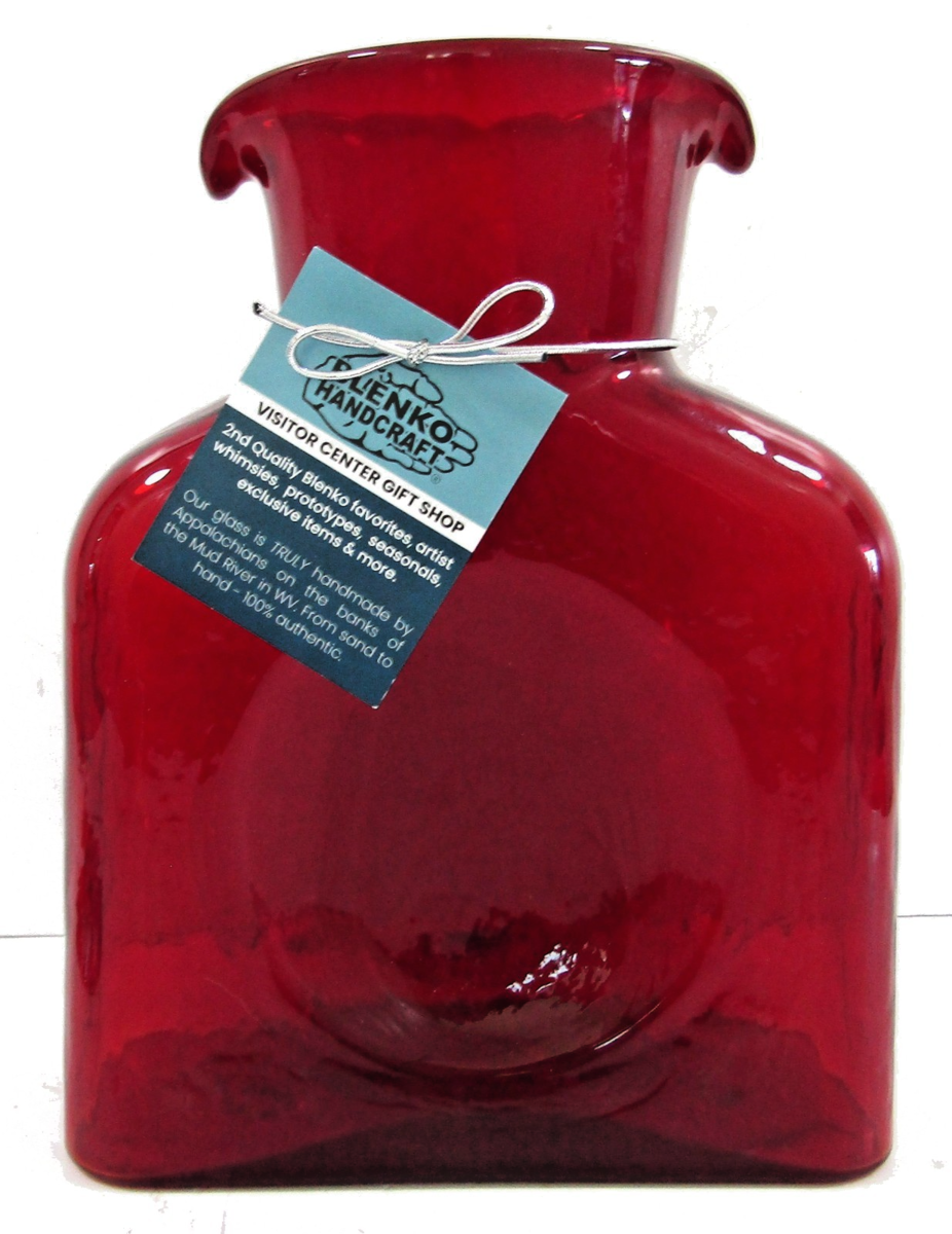 The Blenko 384 Ruby Red Special Edition Eclipse Water Pitcher is a stunning piece of contemporary American art glass. Hand-blown and handcrafted in the United States, this glossy red pitcher features a solid rectangular shape with dimensions of 6.5 inches in length, 8.25 inches in height, and 3 inches in width. It weighs 2.7 pounds and is marked with the signature Blenko 2025. This pitcher is a unique and elegant addition to any home decor, perfect for serving water in style. Care instructions recommend hand washing only to preserve its original finish.