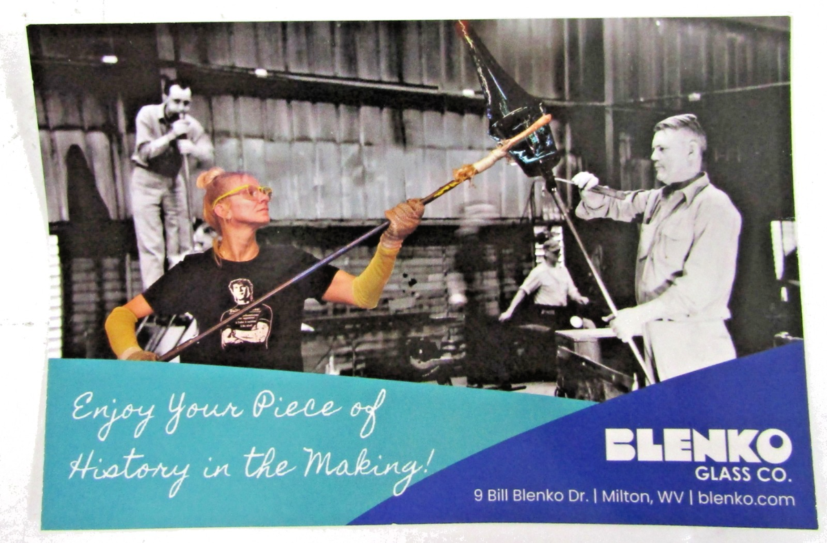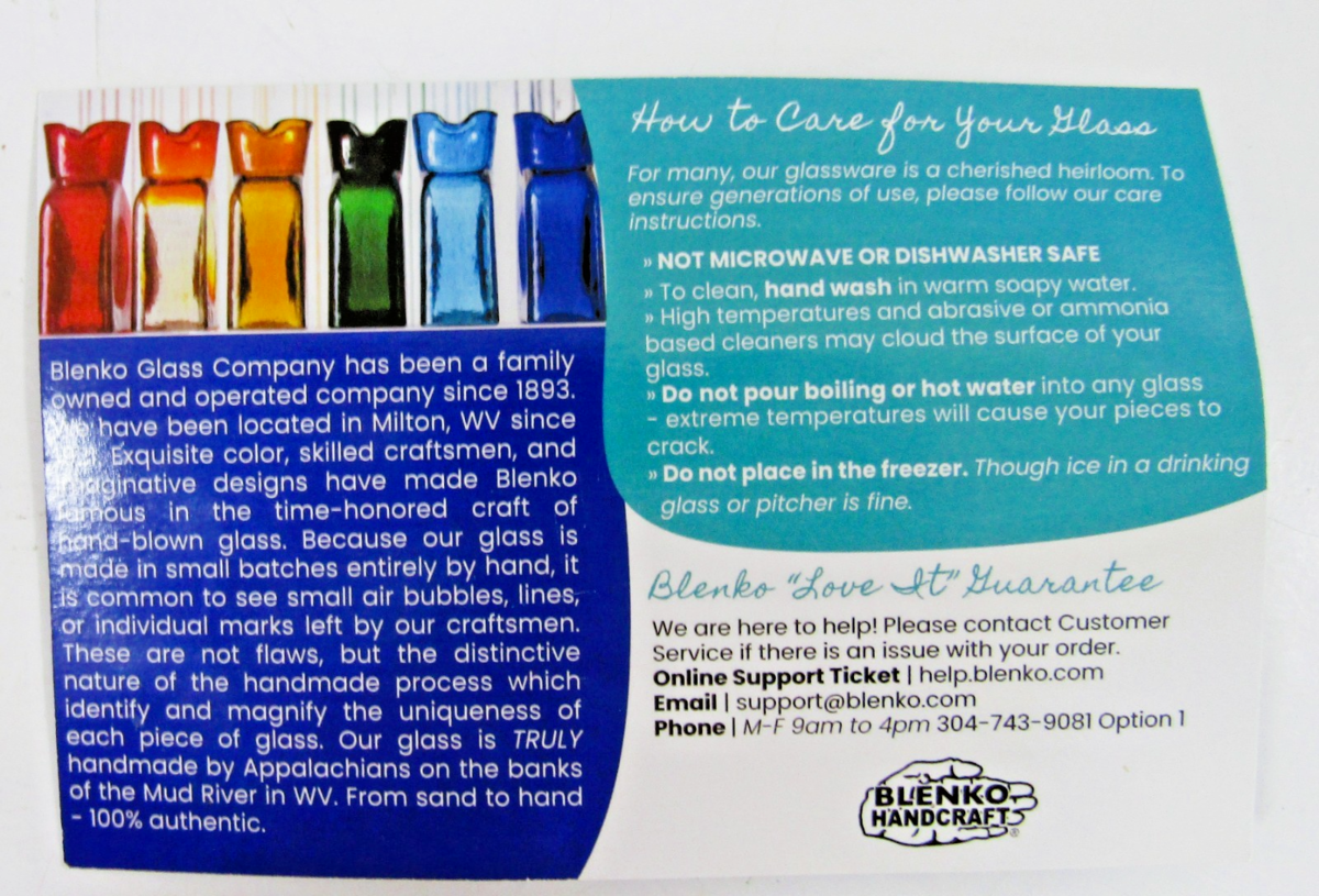 Comes with Blenko card, visitor center card on elastic cord, round white Blenko Handcraft sticker, Blenko Handcraft Made in USA gold foil sticker and it is stamped BLENKO 2025.